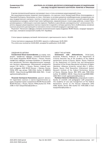 О. В. Филимонов понимает под посткриминальным контролем осуществление наблюдения за лицами, осужденными условно, с отсрочкой исполнения наказания, к ограничению по службе и к исправительным работам, подчеркивая, что данный вид контроля осуществляется не только со стороны государства, но и со стороны общественности [Филимонов, 1991: 34]. Позиция автора такова, что посткриминальный контроль – это автономная часть механизма уголовно-правового регулирования, обеспечивает экономию уголовной прогрессии. А. А. Дорожинский включает в понятие посткриминального контроля все категории лиц, состоящих на учете в УИИ, в том числе, контроль за УДО-осужденными [Дорожинский, 2021: 83]. К. В. Михайлов и вовсе отождествляет понятия посткриминального контроля и контроля за УДО-осужденными [Михайлов, 2010: 119]. На наш взгляд посткриминальный контроль не имеет ничего общего с контролем за УДО-осужденными и является больше криминологической характеристикой.