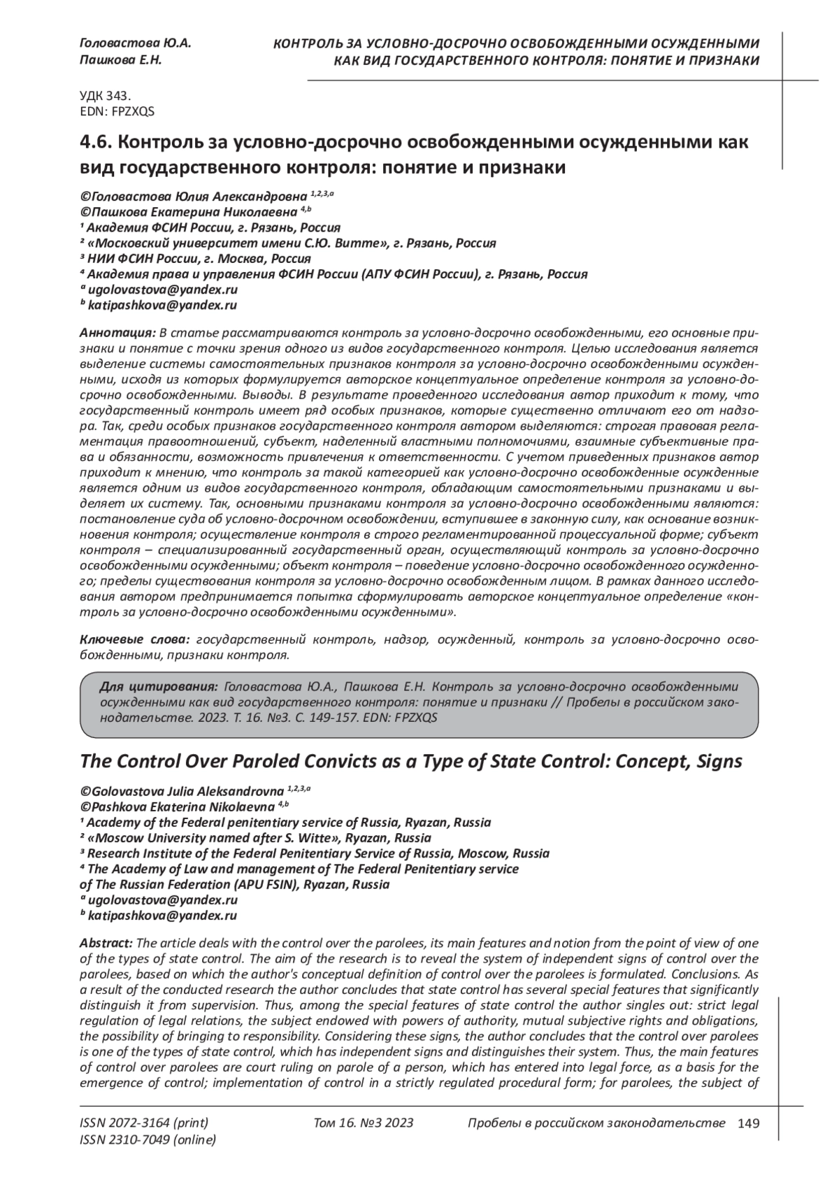 В статье рассматриваются контроль за условно-досрочно освобожденными, его основные признаки и понятие с точки зрения одного из видов государственного контроля. Целью исследования является выделение системы самостоятельных признаков контроля за условно-досрочно освобожденными осужденными, исходя из которых формулируется авторское концептуальное определение контроля за условно-досрочно освобожденными. Выводы. В результате проведенного исследования автор приходит к тому, что государственный контроль имеет ряд особых признаков, которые существенно отличают его от надзора. Так, среди особых признаков государственного контроля автором выделяются: строгая правовая регламентация правоотношений, субъект, наделенный властными полномочиями, взаимные субъективные права и обязанности, возможность привлечения к ответственности. С учетом приведенных признаков автор приходит к мнению, что контроль за такой категорией как условно-досрочно освобожденные осужденные является одним из видов государственного контроля, обладающим самостоятельными признаками и выделяет их систему. Так, основными признаками контроля за условно-досрочно освобожденными являются: постановление суда об условно-досрочном освобождении, вступившее в законную силу, как основание возникновения контроля; осуществление контроля в строго регламентированной процессуальной форме; субъект контроля - специализированный государственный орган, осуществляющий контроль за условно-досрочно освобожденными осужденными; объект контроля - поведение условно-досрочно освобожденного осужденного; пределы существования контроля за условно-досрочно освобожденным лицом. В рамках данного исследования автором предпринимается попытка сформулировать авторское концептуальное определение «контроль за условно-досрочно освобожденными осужденными».