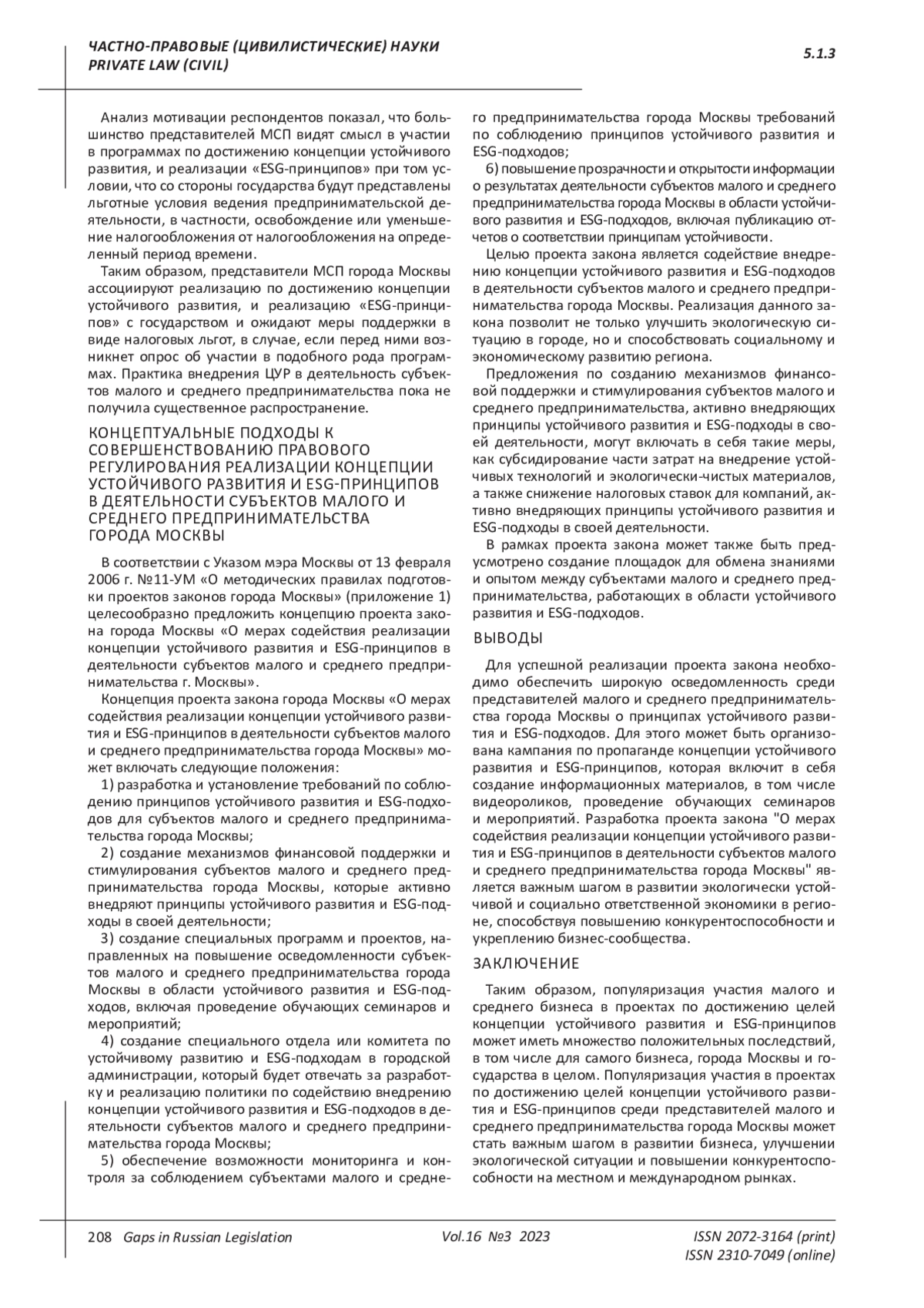 Целью работы является анализ проведенного социологического исследования, посвященного выявлению особенностей понимания и восприятия концепции устойчивого развития и ESG-принципов представителями малого и среднего предпринимательства (МСП) города Москвы, определению степени их готовности принимать участие в реализации концепции устойчивого развития и ESG-принципов в рамках своей деятельности, а также разработка концептуальных подходов к совершенствованию правового регулирования реализации концепции устойчивого развития и ESG-принципов в деятельности субъектов малого и среднего предпринимательства города Москвы. Проведенное социологическое исследование показало то, что опрошенные представители МСП города Москвы ассоциируют действия по реализации концепции устойчивого развития и ESG-принципов с государственными инициативами, при этом выражают готовность принимать участие в подобного рода проектах, при условии, если со стороны государства, органов муниципальной власти будут предложены меры поддержки, например, в виде налоговых льгот. Кроме того, в результате проведенного исследования сделан вывод о целесообразности разработки концепции проекта закона города Москвы «О мерах содействия реализации концепции устойчивого развития и ESG-принципов в деятельности субъектов малого и среднего предпринимательства г. Москвы», а также сформулированы отдельные положения концепции проекта закона.