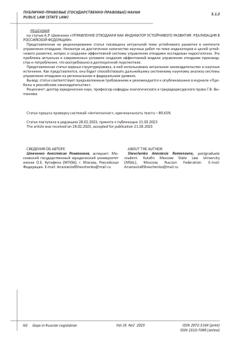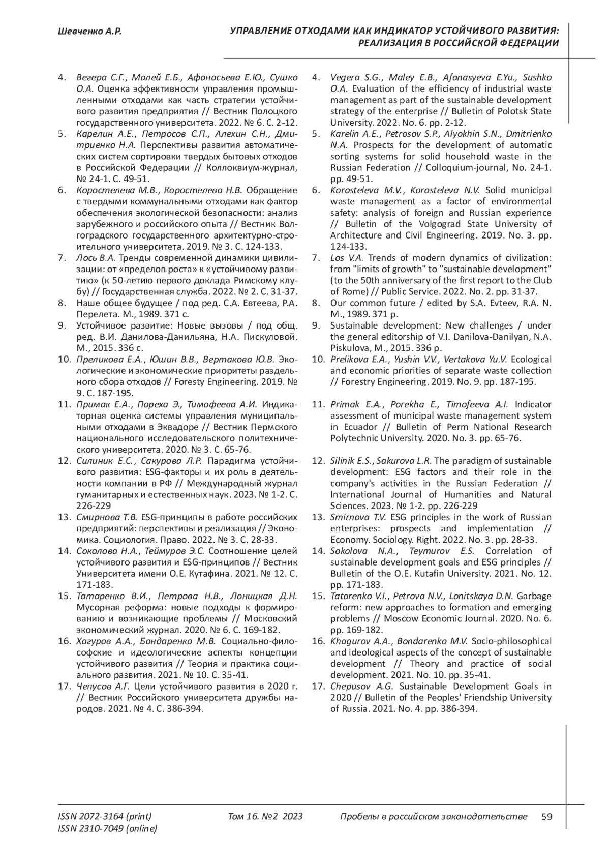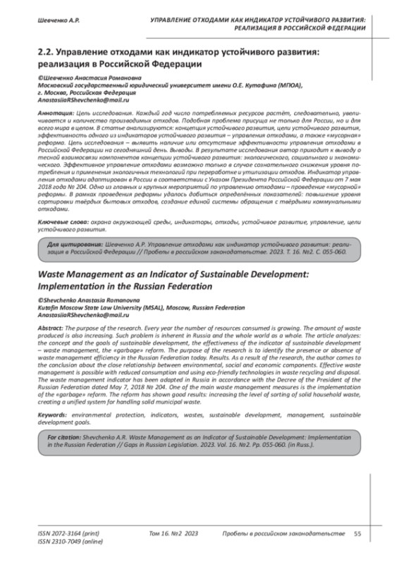 ШЕВЧЕНКО А. Р. УПРАВЛЕНИЕ ОТХОДАМИ КАК ИНДИКАТОР УСТОЙЧИВОГО РАЗВИТИЯ: РЕАЛИЗАЦИЯ В РОССИЙСКОЙ ФЕДЕРАЦИИ // ПРОБЕЛЫ В РОССИЙСКОМ ЗАКОНОДАТЕЛЬСТВЕ. 2023. Т. 16 № 2