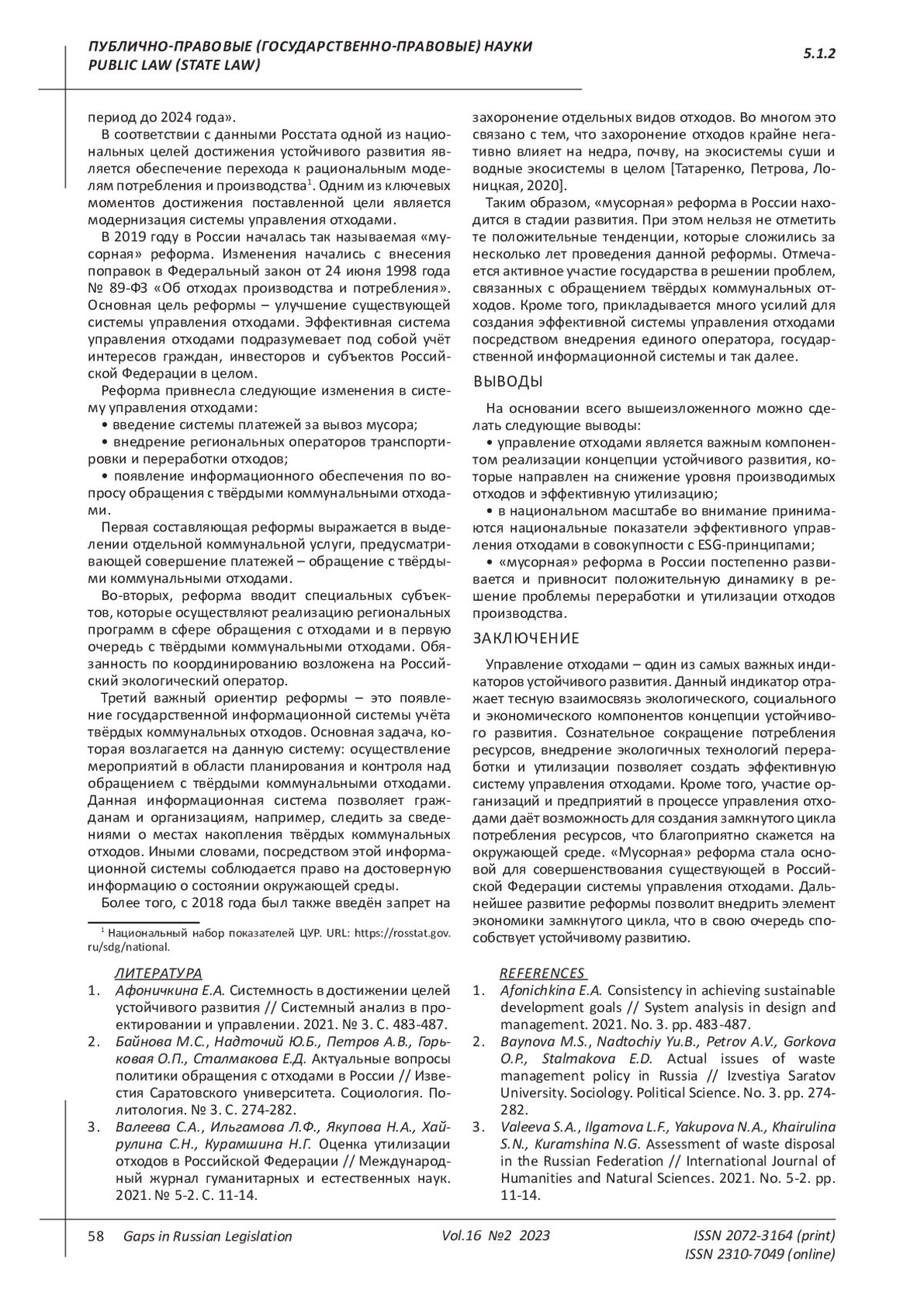 Статья: УПРАВЛЕНИЕ ОТХОДАМИ КАК ИНДИКАТОР УСТОЙЧИВОГО РАЗВИТИЯ: РЕАЛИЗАЦИЯ В РОССИЙСКОЙ ФЕДЕРАЦИИ (2023)