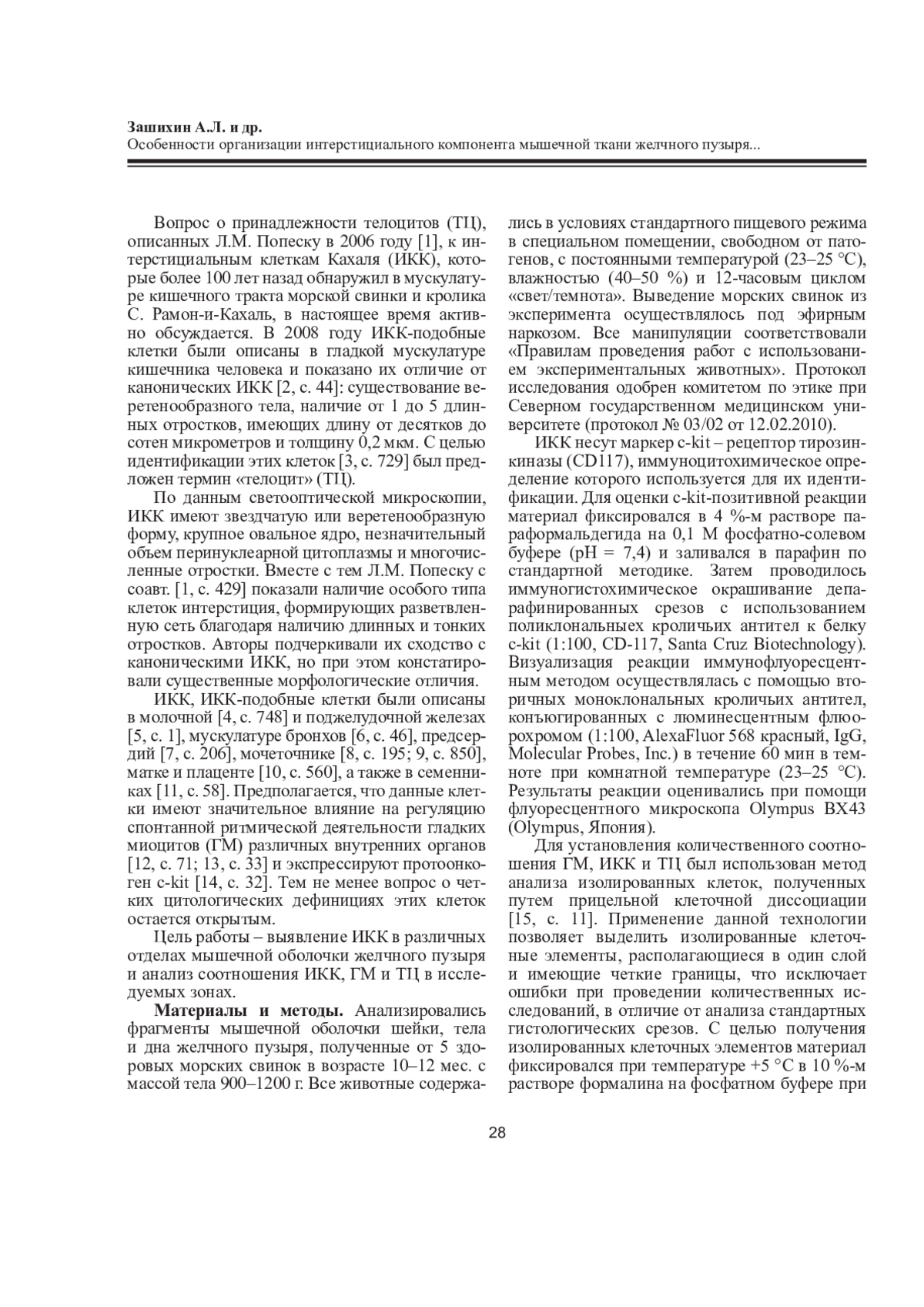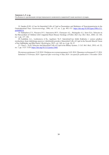 20. Зашихин А.Л., Любезнова А.Ю., Агафонов Ю.В. Интерстициальные клетки Кахаля в составе гладкой мышечной ткани желчного пузыря и желчных протоков // Морфология. 2015. Т. 148, No 4. С. 24-27. EDN: UDDTSV