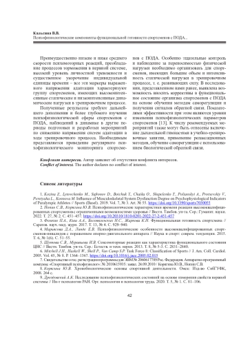 КАЛЬСИНА В. В. ПСИХОФИЗИОЛОГИЧЕСКИЕ КОМПОНЕНТЫ ФУНКЦИОНАЛЬНОЙ ГОТОВНОСТИ СПОРТСМЕНОВ С ПОРАЖЕНИЕМ ОПОРНО-ДВИГАТЕЛЬНОГО АППАРАТА ПРИ РАЗНОЙ НАПРАВЛЕННОСТИ ТРЕНИРОВОЧНОГО ПРОЦЕССА // ЖУРНАЛ МЕДИКО-БИОЛОГИЧЕСКИХ ИССЛЕДОВАНИЙ. 2025. Т. 13 № 1