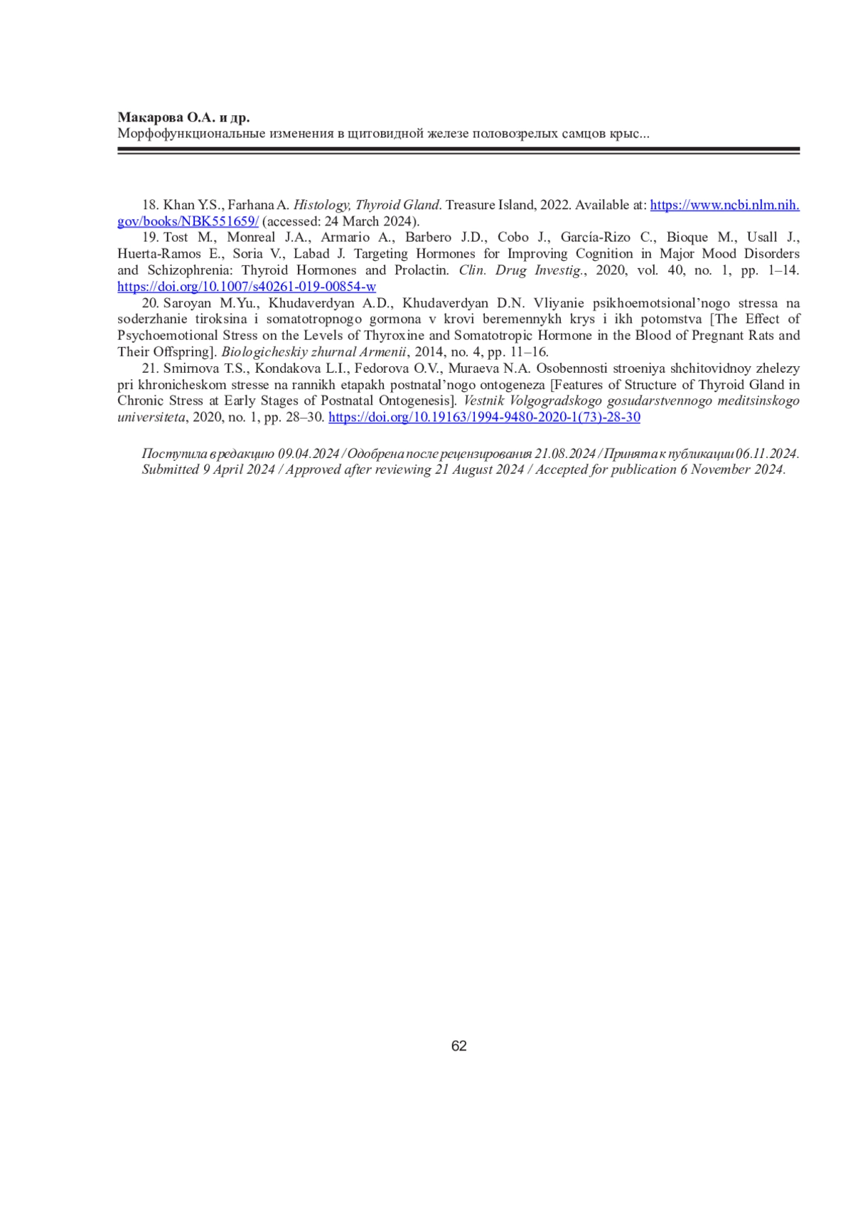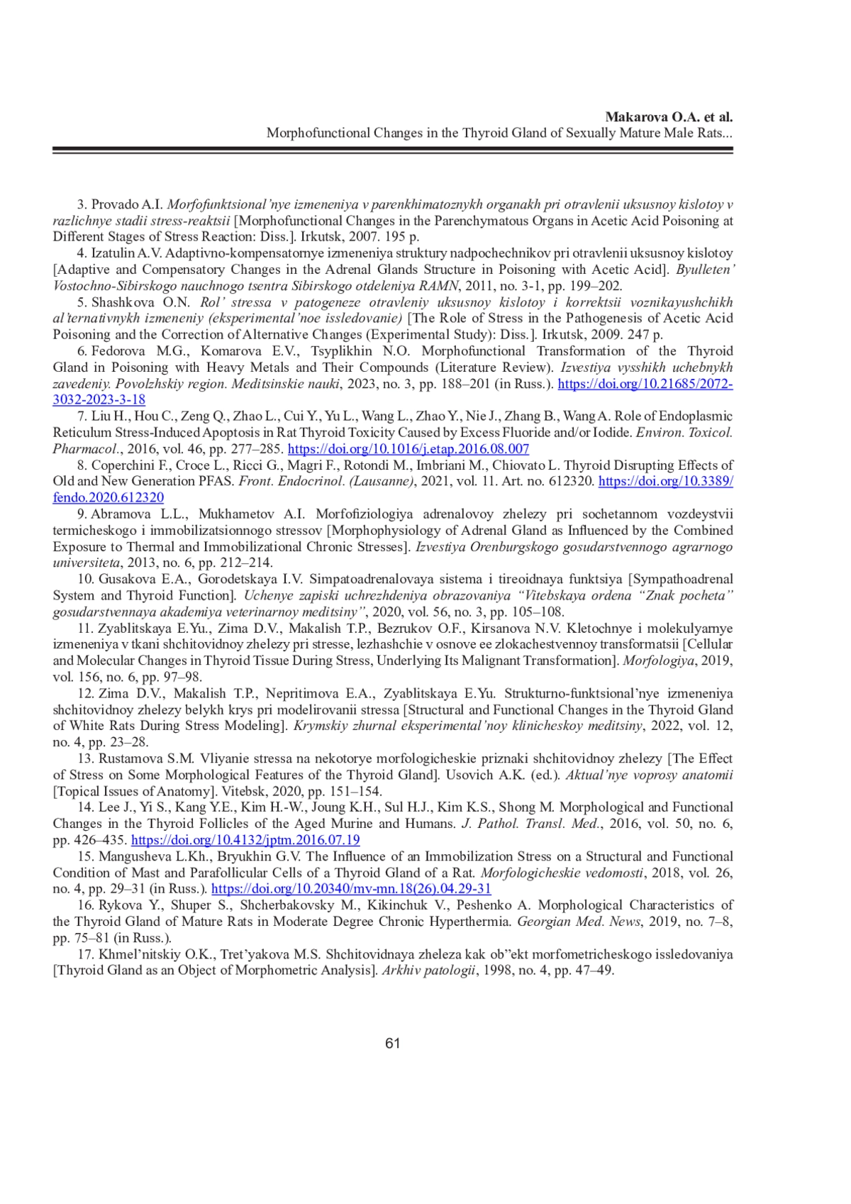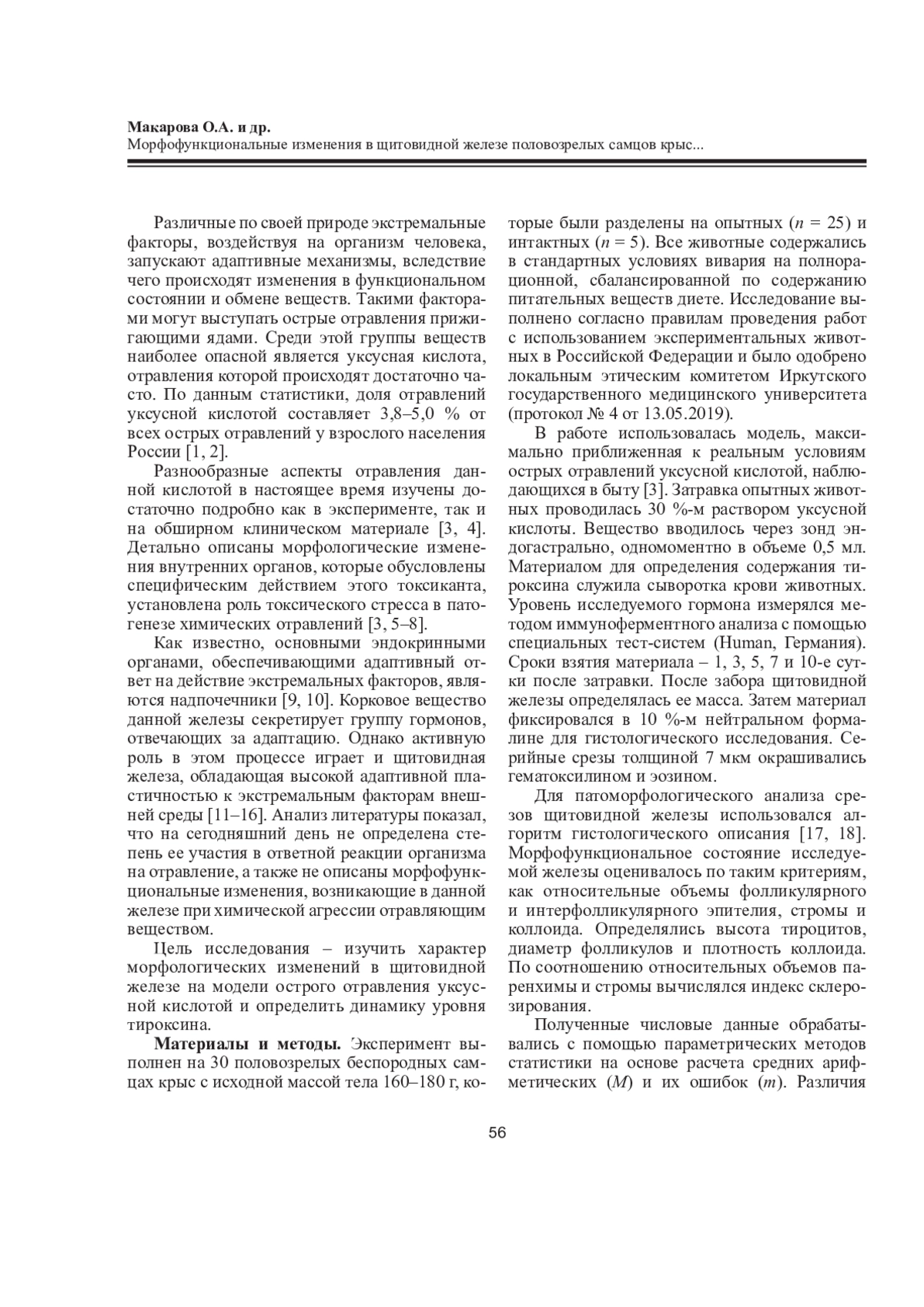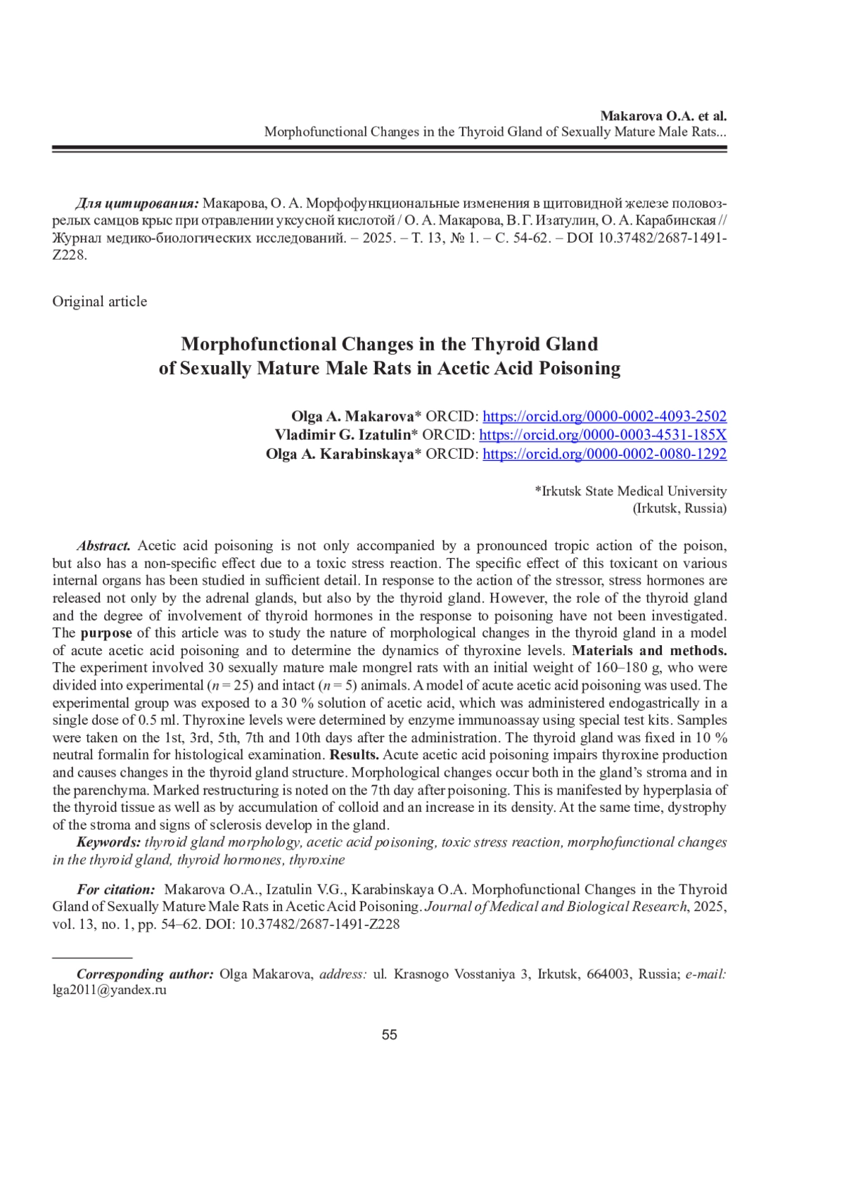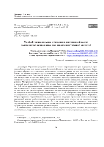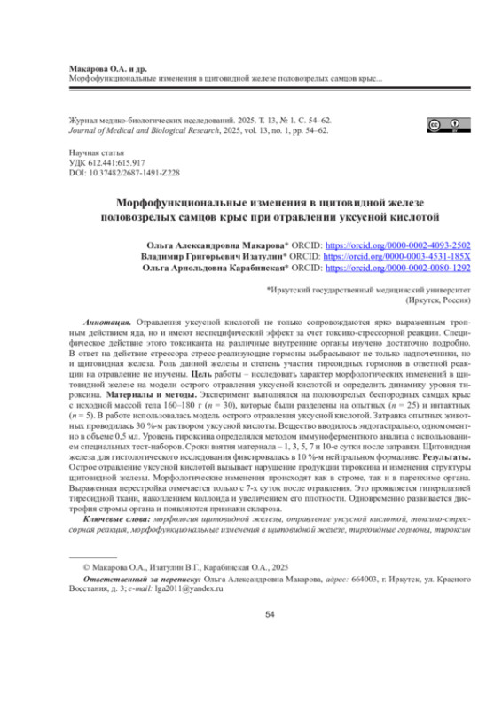 МАКАРОВА О. А., ИЗАТУЛИН В. Г., КАРАБИНСКАЯ О. А. МОРФОФУНКЦИОНАЛЬНЫЕ ИЗМЕНЕНИЯ В ЩИТОВИДНОЙ ЖЕЛЕЗЕ ПОЛОВОЗРЕЛЫХ САМЦОВ КРЫС ПРИ ОТРАВЛЕНИИ УКСУСНОЙ КИСЛОТОЙ // ЖУРНАЛ МЕДИКО-БИОЛОГИЧЕСКИХ ИССЛЕДОВАНИЙ. 2025. Т. 13 № 1