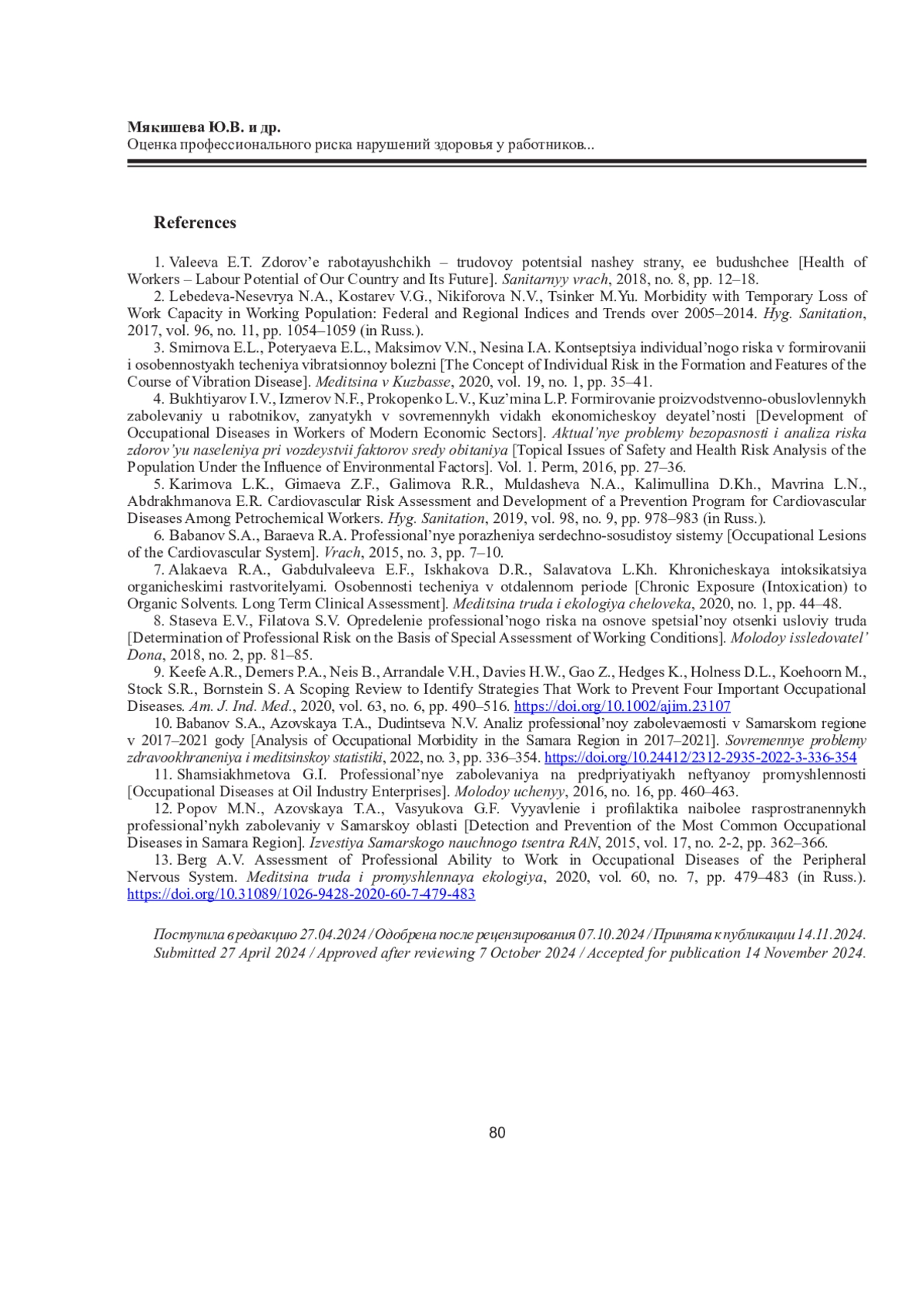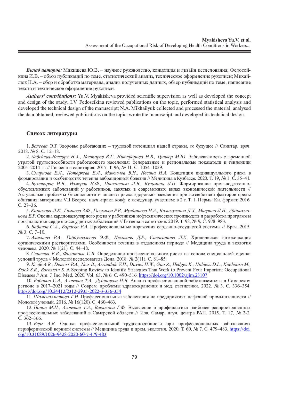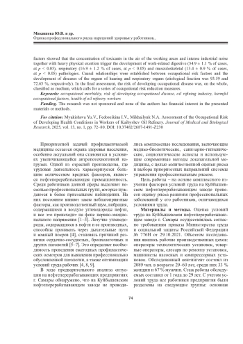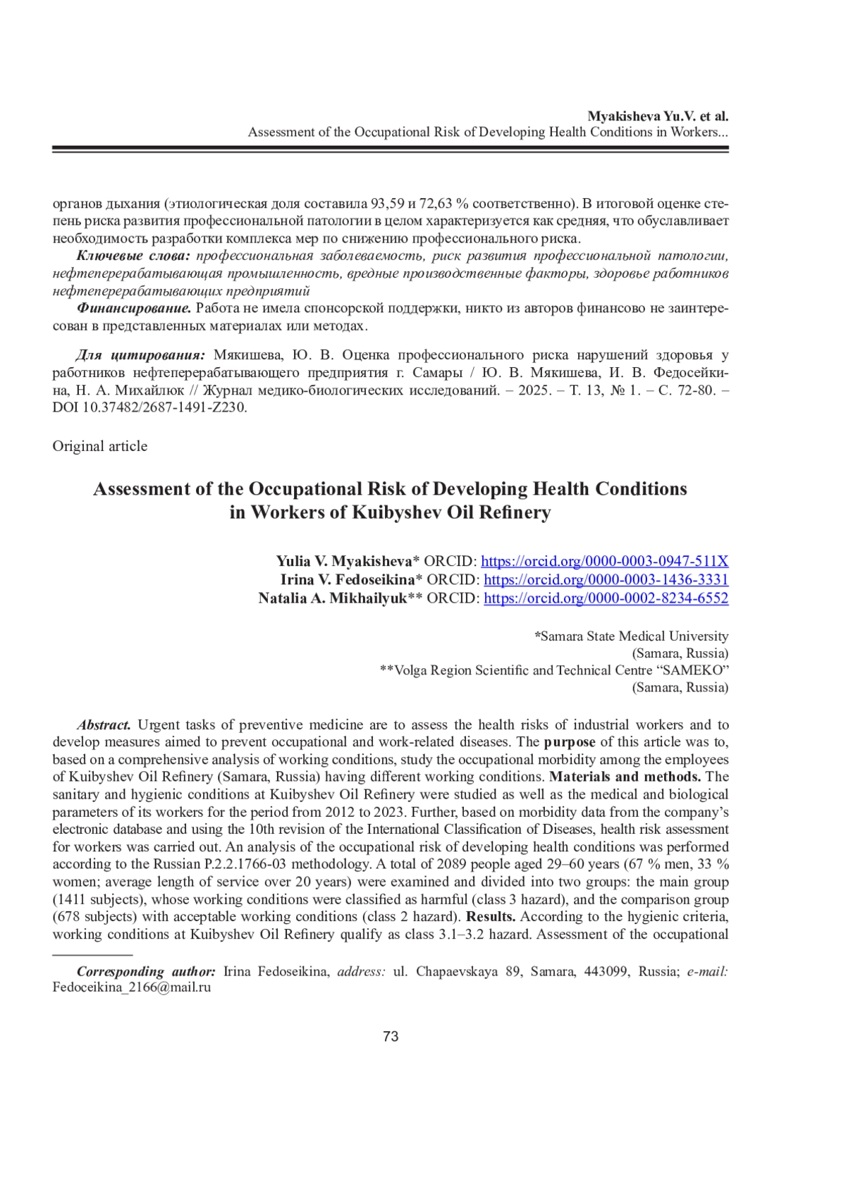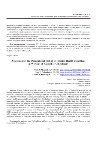 МЯКИШЕВА Ю. В., ФЕДОСЕЙКИНА И. В., МИХАЙЛЮК Н. А. ОЦЕНКА ПРОФЕССИОНАЛЬНОГО РИСКА НАРУШЕНИЙ ЗДОРОВЬЯ У РАБОТНИКОВ НЕФТЕПЕРЕРАБАТЫВАЮЩЕГО ПРЕДПРИЯТИЯ Г. САМАРЫ // ЖУРНАЛ МЕДИКО-БИОЛОГИЧЕСКИХ ИССЛЕДОВАНИЙ. 2025. Т. 13 № 1