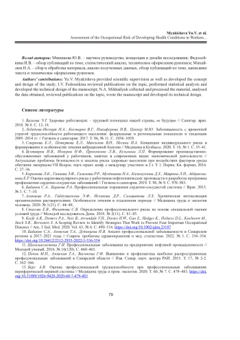 Результаты. Согласно гигиеническим критериям, условия труда на исследуемом предприятии относятся к классу 3.1-3.2. Оценка производственных факторов показала, что содержание вредных веществ в воздухе рабочей зоны, воздействие интенсивного производственного шума в сочетании с тяжелыми физическими нагрузками выступают в качестве пусковых механизмов развития производственно-обусловленных патологий пищевари тельной (34,9±1,1 % случаев, при p < 0,05), дыхательной (16,9±1,2 % случаев, при p < 0,05), опорно-двигательной (13,4±0,9 % случаев, при p < 0,05) си стем. Выявлены причинно-следственные связи между неблагоприятными производственными факторами и развитием болезней слухового анализатора и органов дыхания (этиологическая доля составила 93,59 и 72,63 % соответственно).