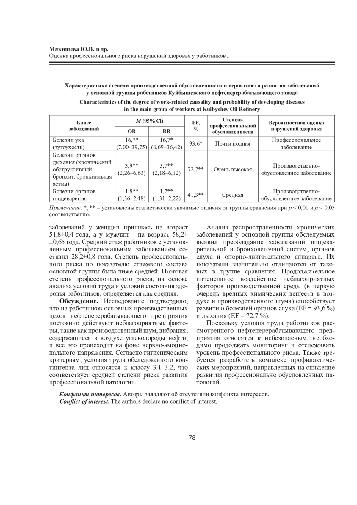 Материалы и методы. Изу-чались санитарно-гигиенические условия производственной среды на Куйбышевском нефтеперерабатывающем заводе, а также медико-биологические показатели его сотрудников за период с 2012 по 2023 год, после чего на основе данных о случаях заболеваемости, полученных из электронной базы предприятия, с опорой на Международную классификацию болезней 10-го пересмотра была проведена оценка риска здоровью работников. Анализ профессионального риска развития нарушений здоровья осуществлялся по методике Р.2.2.1766-03. Обследовано 2089 чел. в возрасте 29-60 лет (67 % мужчин, 33 % женщин; средний стаж - более 20 лет), которые были разделены на две группы: основная - 1411 чел., условия работы которых классифицировались как вредные (3-й класс опасности), сравнения - 678 чел. с допустимыми условиями труда (2-й класс).