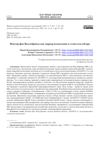 Представлен анализ литературных данных о роли фактора фон Виллебранда (ФВ) в системе гемостаза и воспаления, дана патофизиологическая оценка влияния взаимодействия ФВ с патогенными микробиологическими агентами на его метаболизм и роли металлопротеиназы ADAMTS-13 в этом процессе. Описаны структура, функции и процессы обмена ФВ в организме при патологических состояниях. Приведены данные, свидетельствующие, что высвобождение ФВ из эндотелиоцитов способствует связыванию и снижению активности ADAMTS-13, регулирующей функциональную активность данного фактора. Это, в свою очередь, приводит к накоплению сверхкрупных мультимеров данного маркера в кровотоке, индуцирующему развитие тромбоза. Отмечено, что биологически активные вещества, задействованные в патологических процессах, выступают стимуляторами экзоцитоза ФВ из телец Вейбеля-Паладе, что приводит к развитию нарушений микроциркуляторного звена. Цель обзора - провести оценку роли ФВ в патогенезе воспалительных и тромботических нарушений. В выборку были включены оригинальные статьи и краткие сообщения, опубликованные с 2005 по 2022 год, размещенные в базах данных PubMed, eLIBRARY. RU, «КиберЛенинка», посвященные патофизиологической роли ФВ в поддержании системного воспаления. Применена следующая стратегия поиска и отбора научных статей с использованием терминов, индексированных MeSH: von Willebrand factor [Supplementary Concept], ADAMTS-13 [MeSH Terms], systemic inflammation [MeSH Terms], thrombotic disorders [MeSH Terms]. Анализ научных публикаций позволяет рассматривать ФВ одновременно как маркер гемостаза и воспаления. Отмечено влияние инфекционных агентов на его метаболизм: при воспалении бактерии, связавшиеся с мультимерами гликопротеина ФВ, преодолевают гемодинамическое воздействие кровотока, ускользают от клеток иммунной системы и фиксируются на поверхности эндотелия, вызывая эндоваскулярные нарушения.
