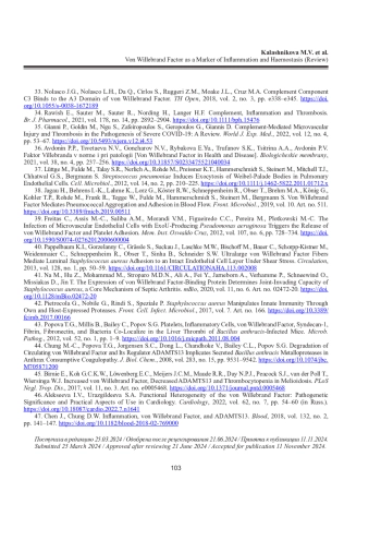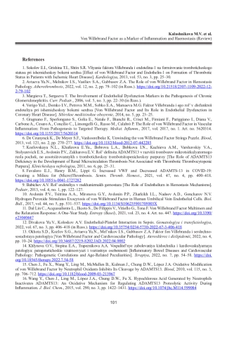 2. Автаева Ю.Н., Мельников И.С., Васильев С.А., Габбасов З.А. Роль фактора фон Виллебранда в патологии гемостаза // Атеротромбоз. 2022. No 2. С. 79-102. DOI: 10.21518/2307-1109-2022-12-2-79-102 EDN: BISWLG