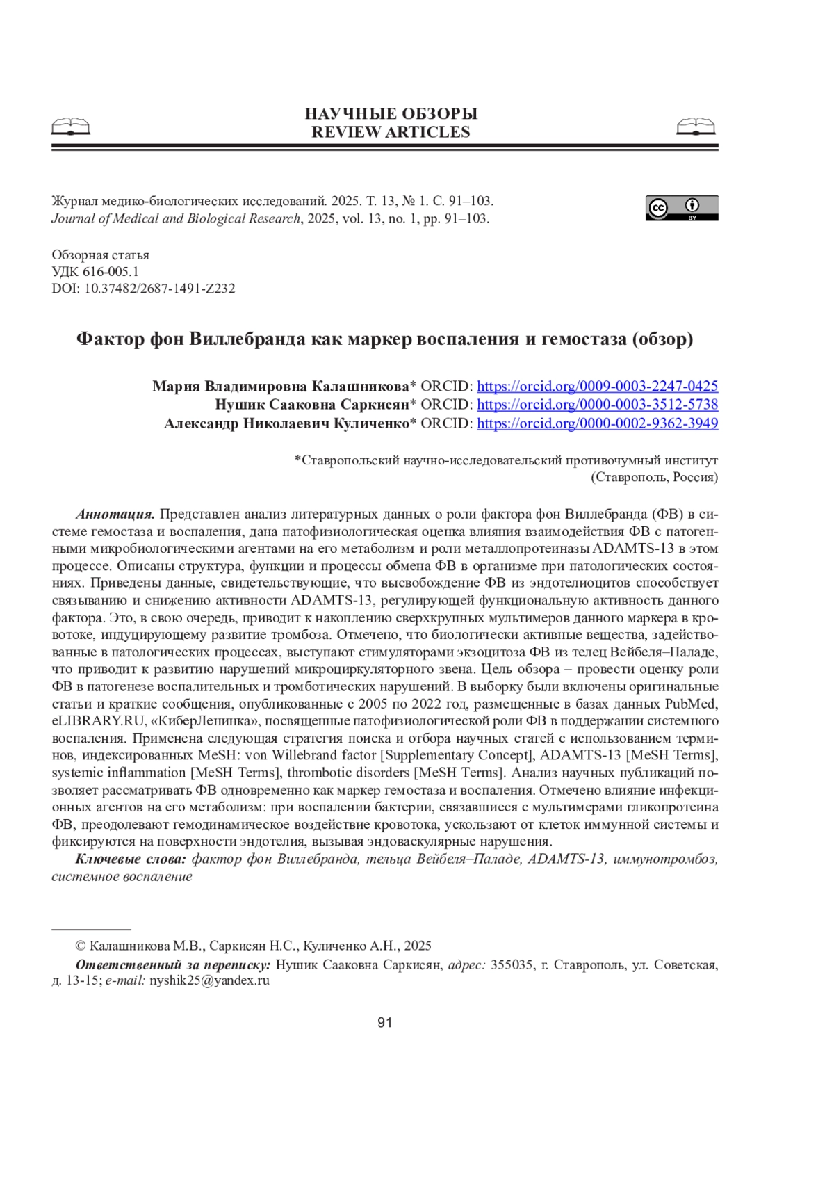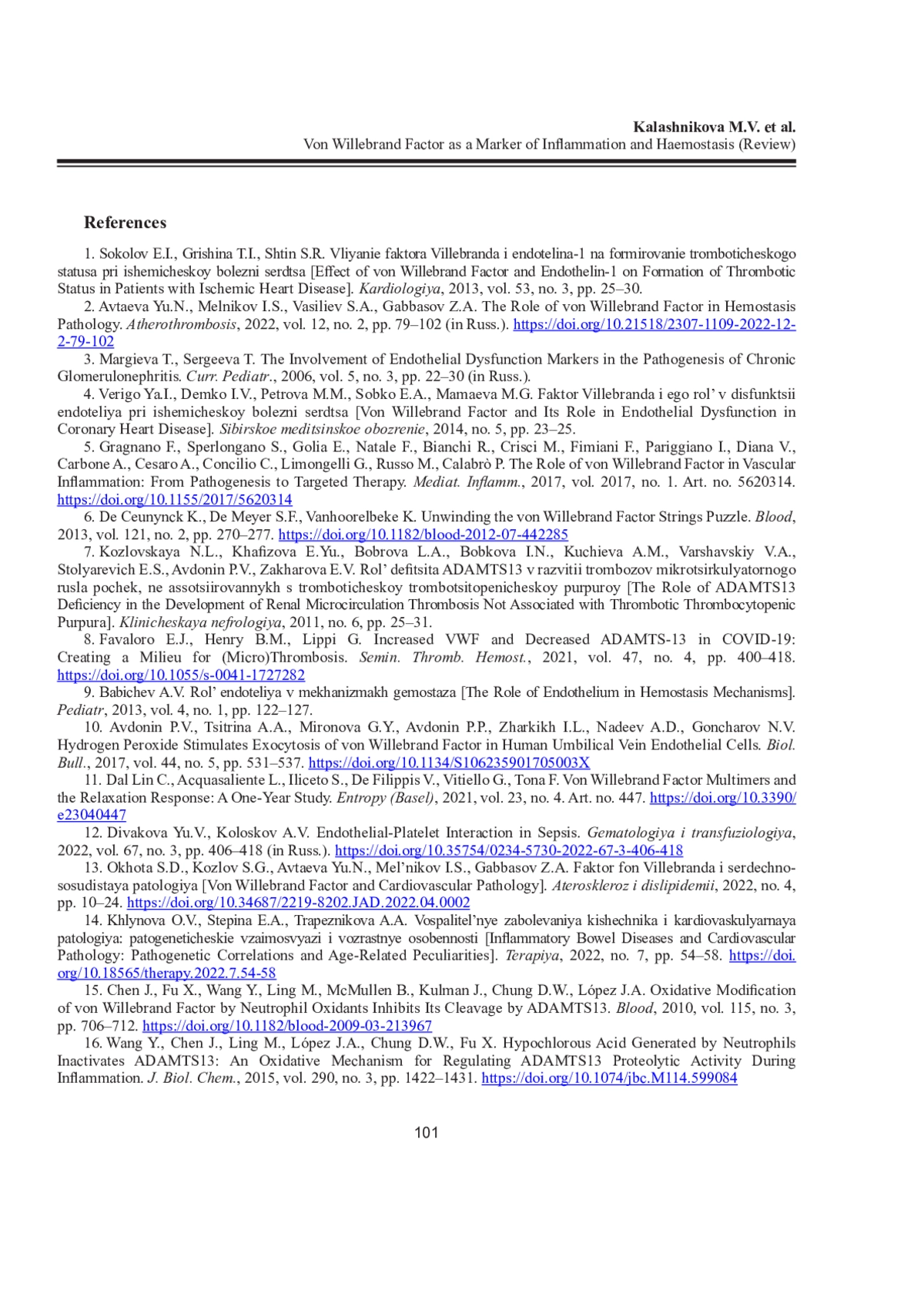 13. Охота С.Д., Козлов С.Г., Автаева Ю.Н., Мельников И.С., Габбасов З.А. Фактор фон Виллебранда и сердечно-сосудистая патология // Атеросклероз и дислипидемии. 2022. No 4 (49). С. 10-24. DOI: 10.34687/2219-8202.JAD.2022.04.0002 EDN: PGZLRT