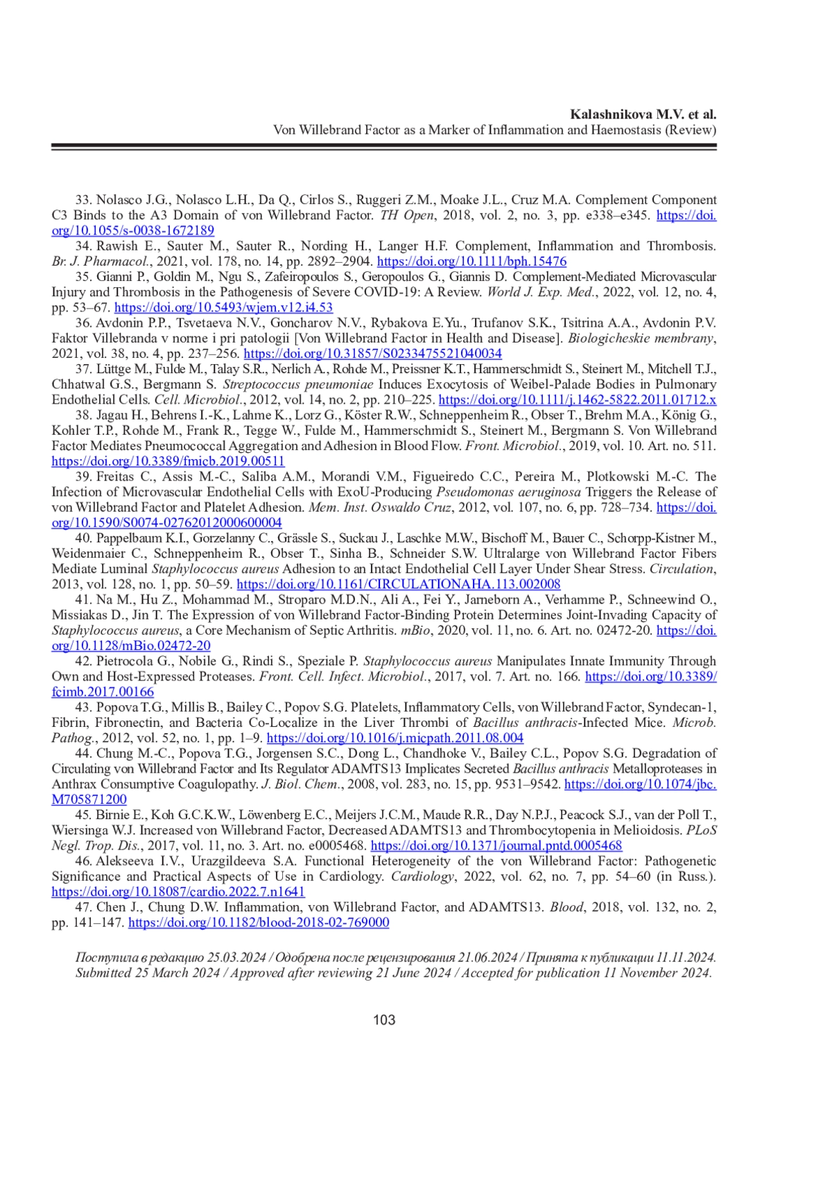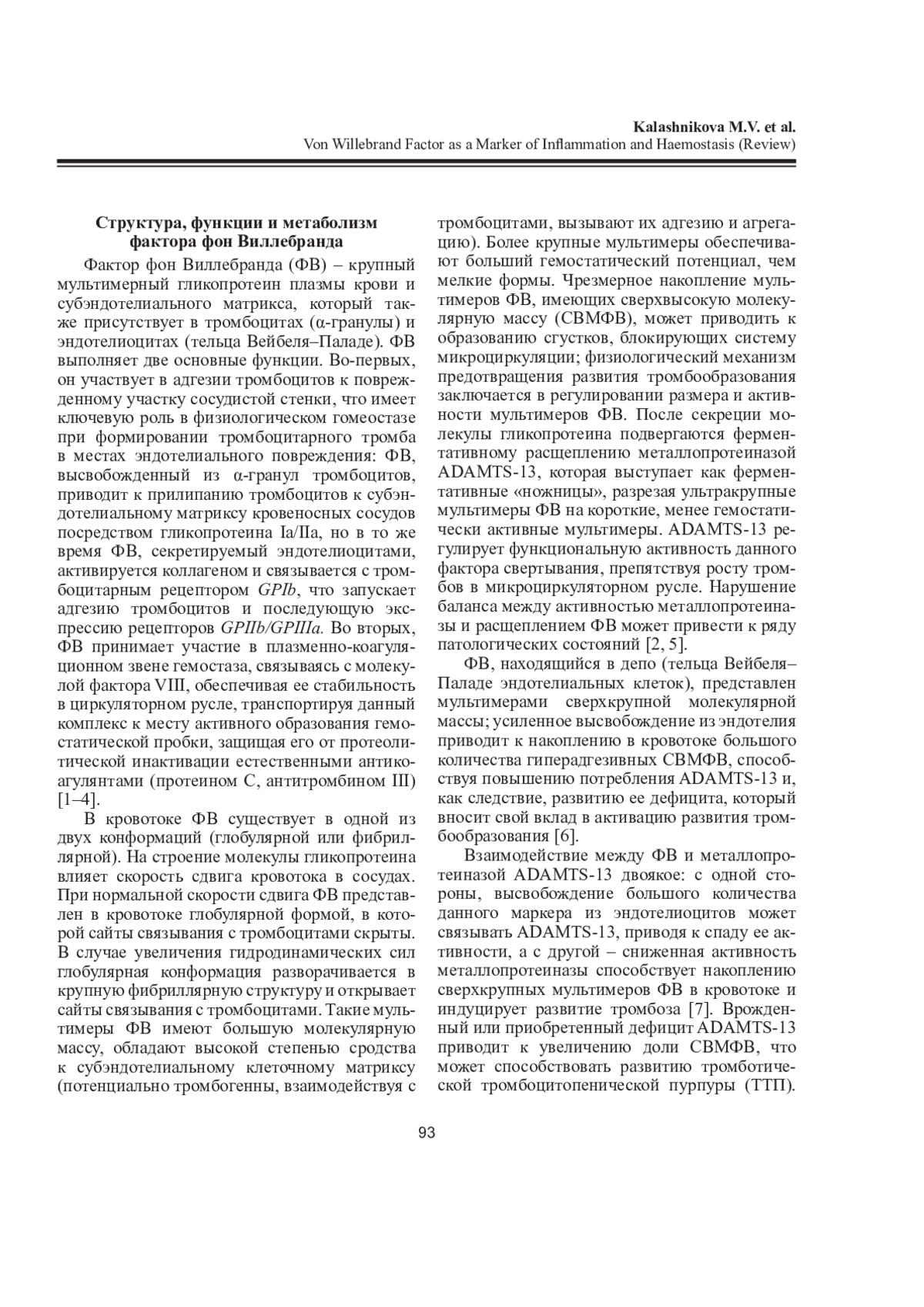 46. Алексеева И.В., Уразгильдеева С.А. Функциональная гетерогенность фактора фон Виллебранда: патогенетическое значение и практические аспекты использования в кардиологии // Кардиология. 2022. Т. 62, No 7. С. 54-60. DOI: 10.18087/cardio.2022.7.n1641 EDN: AMWZQA