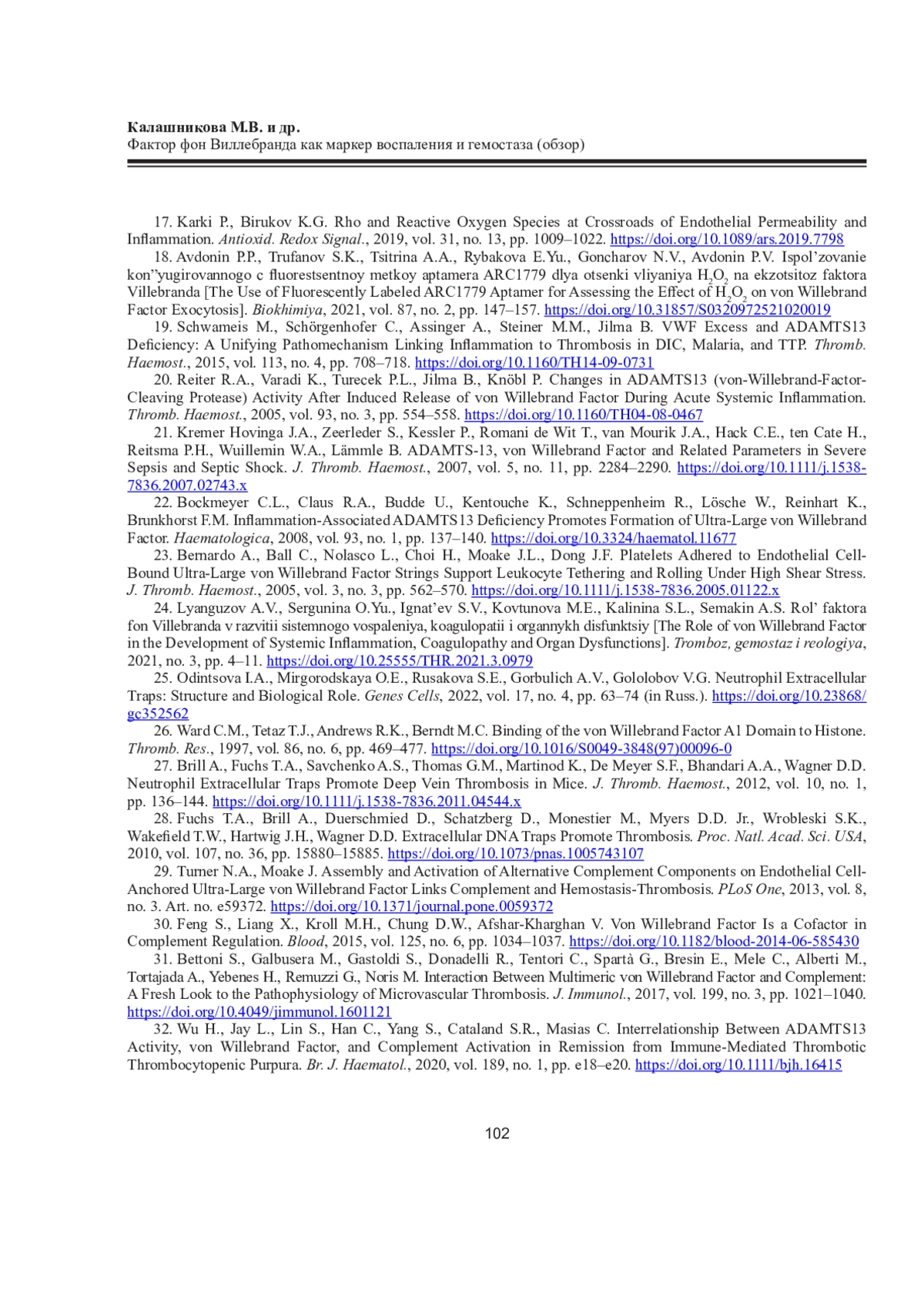 15. Chen J., Fu X., Wang Y., Ling M., McMullen B., Kulman J., Chung D.W., López J.A. Oxidative Modification of von Willebrand Factor by Neutrophil Oxidants Inhibits Its Cleavage by ADAMTS13 // Blood. 2010. Vol. 115, No 3. С. 706-712. DOI: 10.1182/blood-2009-03-213967