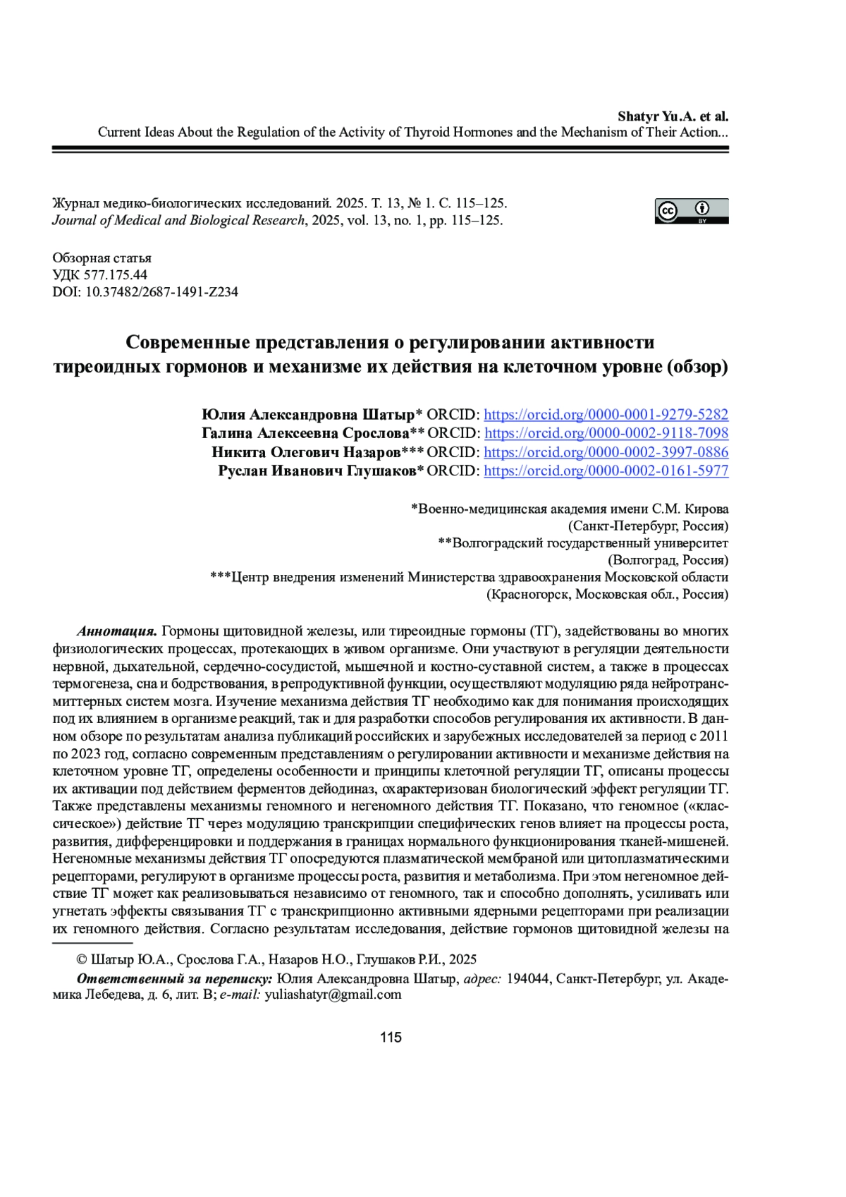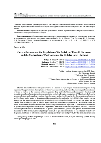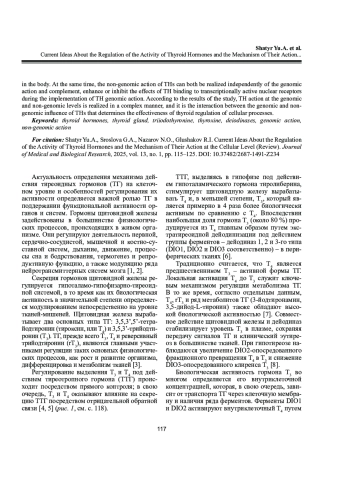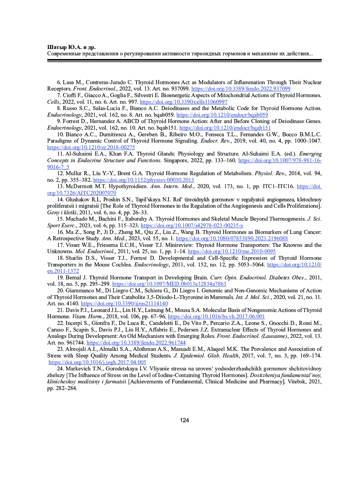 5. Tedeschi L., Vassalle C., Iervasi G., Sabatino L. Main Factors Involved in Thyroid Hormone Action // Molecules. 2021. Vol. 26, No 23. Art. No 7337. DOI: 10.3390/molecules26237337 EDN: ZRNIXT