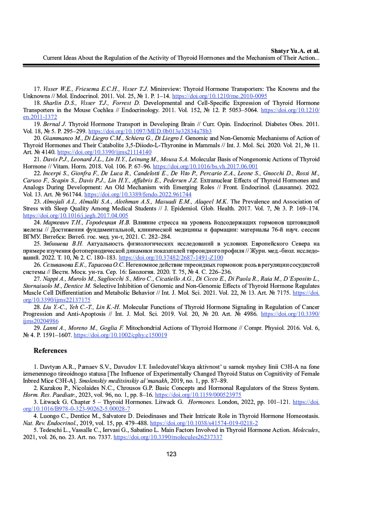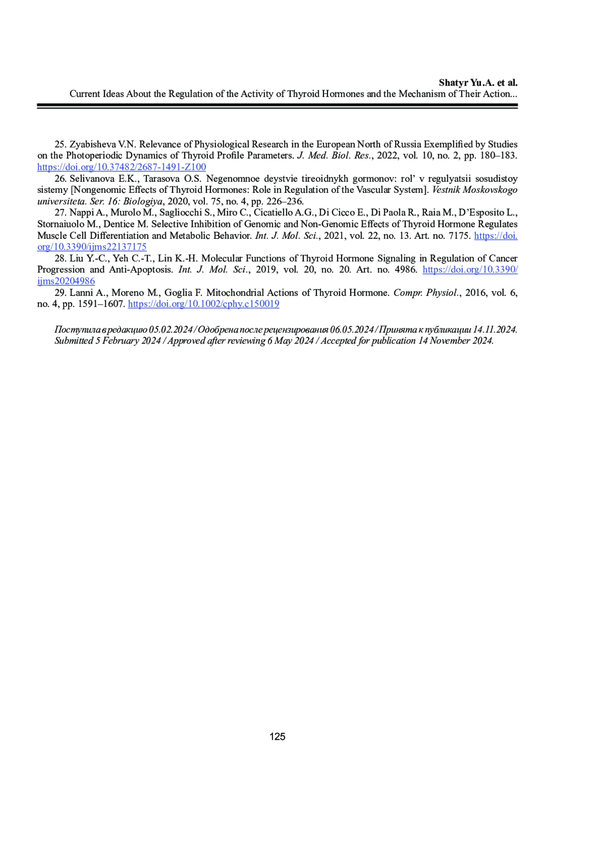26. Селиванова Е.К., Тарасова О.С. Негеномное действие тиреоидных гормонов: роль в регуляции сосудистой системы // Вестн. Моск. ун-та. Сер. 16: Биология. 2020. Т. 75, No 4. С. 226-236. EDN: YAYCOB
