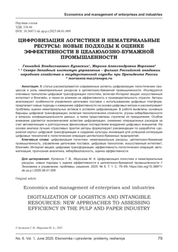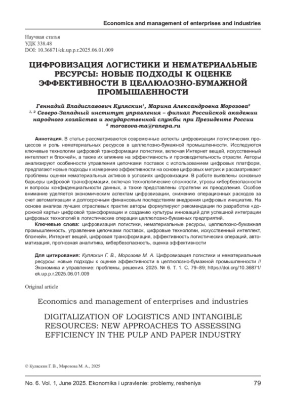 В статье рассматриваются современные аспекты цифровизации логистических процессов и роль нематериальных ресурсов в целлюлозно-бумажной промышленности. Исследуются ключевые технологии цифровой трансформации логистики, включая Интернет вещей, искусственный интеллект и блокчейн, а также их влияние на эффективность и производительность отрасли. Авторы анализируют особенности управления цепочками поставок с использованием цифровых платформ, предлагают новые подходы к измерению эффективности на основе цифровых метрик и рассматривают проблемы оценки нематериальных активов в условиях цифровизации. В работе выявлены основные барьеры цифровой трансформации, включая технологические сложности, угрозы кибербезопасности и вопросы конфиденциальности данных, а также представлены стратегии их преодоления. Особое внимание уделяется экономическим аспектам цифровизации, снижению операционных расходов за счет автоматизации и долгосрочным финансовым последствиям внедрения цифровых инициатив. На основе анализа лучших отраслевых практик авторы формулируют рекомендации по разработке «дорожной карты» цифровой трансформации и созданию культуры инноваций для успешной интеграции цифровых технологий в логистические операции целлюлозно-бумажных предприятий.