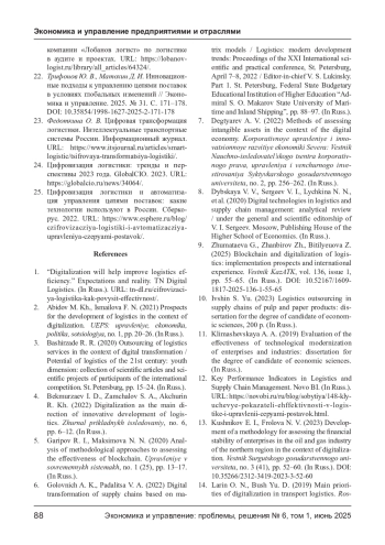 2. Абидов М. Х., Исмаилова Ф. Н. Перспективы развития логистики в условиях цифровизации // УЭПС: управление, экономика, политика, социология. 2021. № 1. С. 20-26. EDN: HPHENC