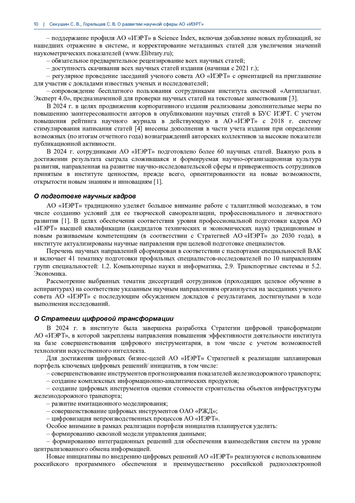 СЕКУШИН С. В., ГОРЕЛЬЦЕВ С. В. О РАЗВИТИИ НАУЧНОЙ СФЕРЫ АО «ИЭРТ» // БЮЛЛЕТЕНЬ УЧЕНОГО СОВЕТА АО "ИЭРТ". 2025. № 10-1