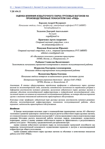 В Центре эксплуатации железных дорог и взаимодействия транспортных систем АО «Институт экономики и развития транспорта» ежемесячно ведутся расчеты избыточного парка грузовых вагонов, его технологических и экономических последствий. С учетом накопленного опыта подготовлена новая редакция Методики расчета показателей работы вагонных парков, позволяющих осуществлять мониторинг, анализ и оценку влияния избыточности парков на эффективность и результативность работы сети (далее – Методика), предназначенной для применения при: