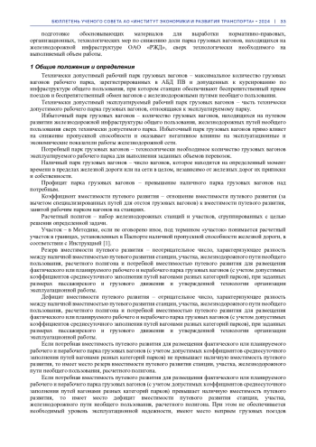 В статье сформулированы определения профицита и избыточного парка грузовых вагонов на железнодорожной сети, изложены методические положения по определению резервов и дефицитов вместимости путевого развития, вычисления избыточного парка грузовых вагонов в границах объектов железнодорожной инфраструктуры и подразделений железнодорожной сети, численной оценки его влияния на показатели эксплуатационной работы, на потери объемов перевозок грузов и снижение показателей надежности транспортного обслуживания.