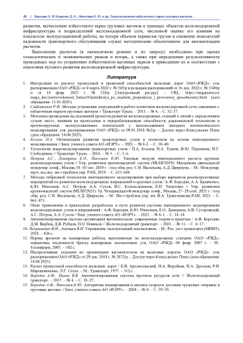 4. Козлов П.А. Оптимизация развития транспортных узлов и полигонов на основе имитационного моделирования // Бюл. ученого совета АО “ИЭРТ”. - 2023. - № 8-2. - С. 30-40.