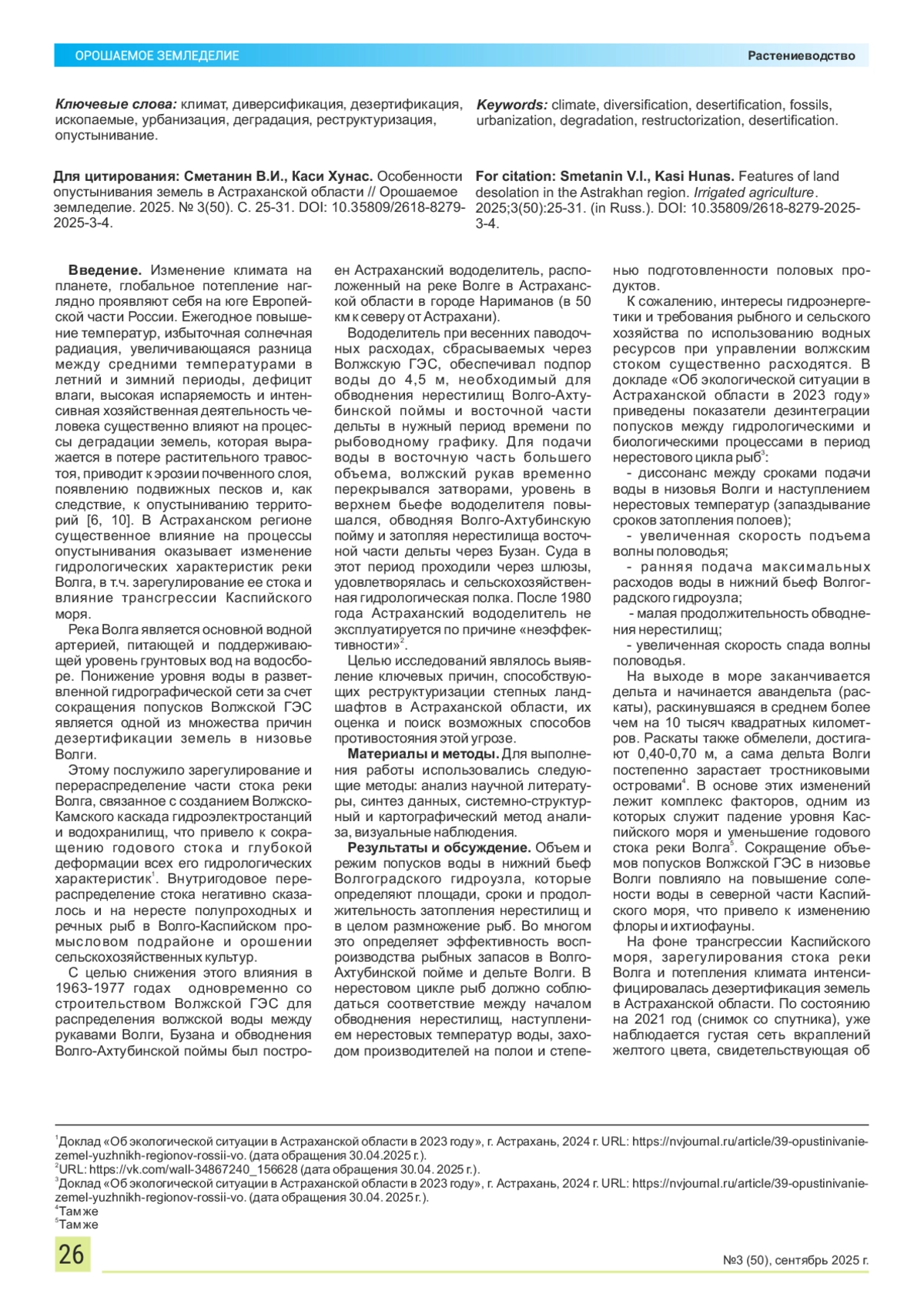 Опустынивание – широко распространённая проблема на засушливых территориях юга России, в том числе в Астраханской области. Отличительной особенностью опустынивания земель в Астраханской области служит диверсификация речного стока ВолгоКамского бассейна и высокая антропогенная нагрузка, формируемая добычей углеводородов как на суше, так и шельфе северной части Каспийского моря. В статье рассмотрена диверсификация гидрологического режима в низовье реки Волги как фактор, способствующий опустыниванию земель в Астраханской области. Цель исследований. Выявление ключевых причин, способствующих реструктуризации степных ландшафтов в Астраханской области, их оценка и поиск возможных способов противостояния этой угрозе. Материалы и методы. Для выполнения работы использовались следующие подходы: анализ научной литературы, синтез данных, системноструктурный и картографический метод анализа, визуальные наблюдения. Результаты и обсуждение. Выявлены причины, способствующие реструктуризации степных ландшафтов и выполнена их оценка. В Астраханском регионе основными факторами, приводящими к деградации земель, являются специфический климат, активный ветровой режим, добыча полезных ископаемых и хозяйственная деятельность человека, урбанизация территорий и др. К причинам, способствующим активизации процессов опустынивания земель, можно отнести зарегулирование водного режима Волго-Камского каскада водохранилищ и строительство Волжской ГЭС, что привело к сокращению зарегулированного годового стока в нижний бьеф гидроузла в сравнении с естественным. Разработана структурно-логическая модель оценки воздействия основных причин реструкторизации степных ландшафтов в Астраханской области. При орошении земель следует отдавать предпочтение ресурсосберегающим технологиям (капельному, дисперсному, аэрозольному или подпочвенному орошению сельскохозяйственных культур, включая методы точного орошения).