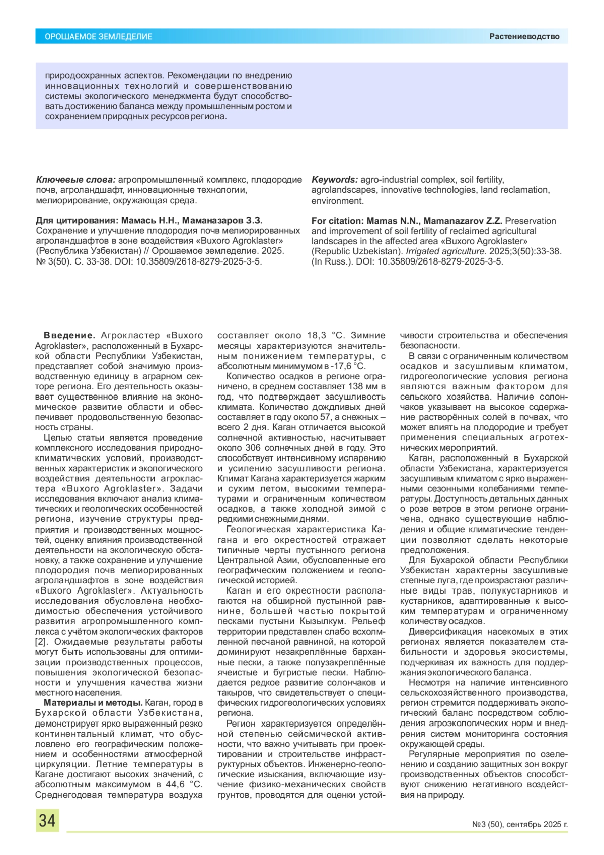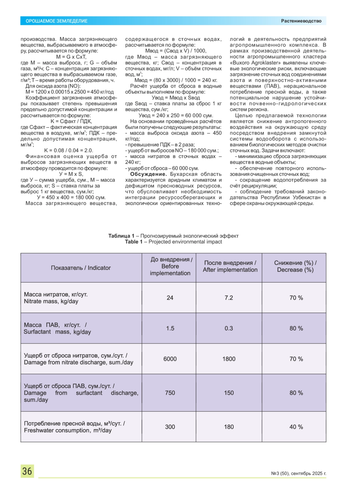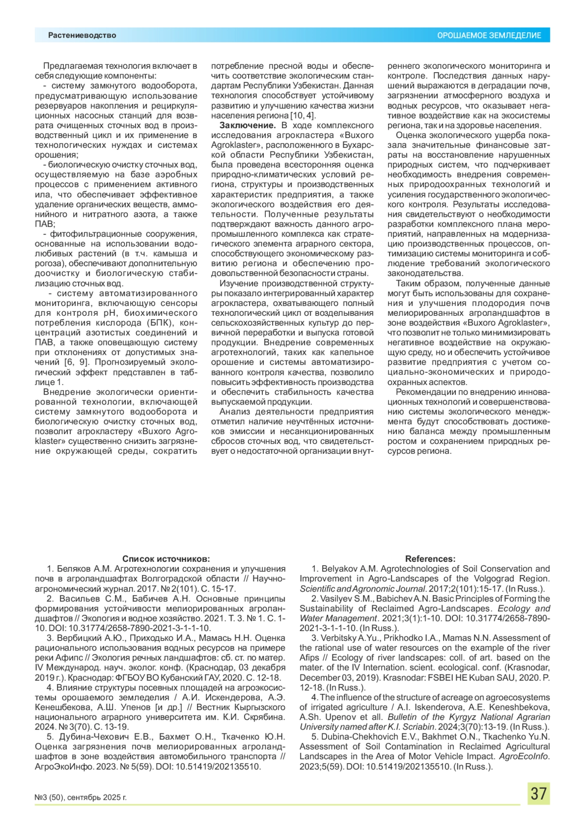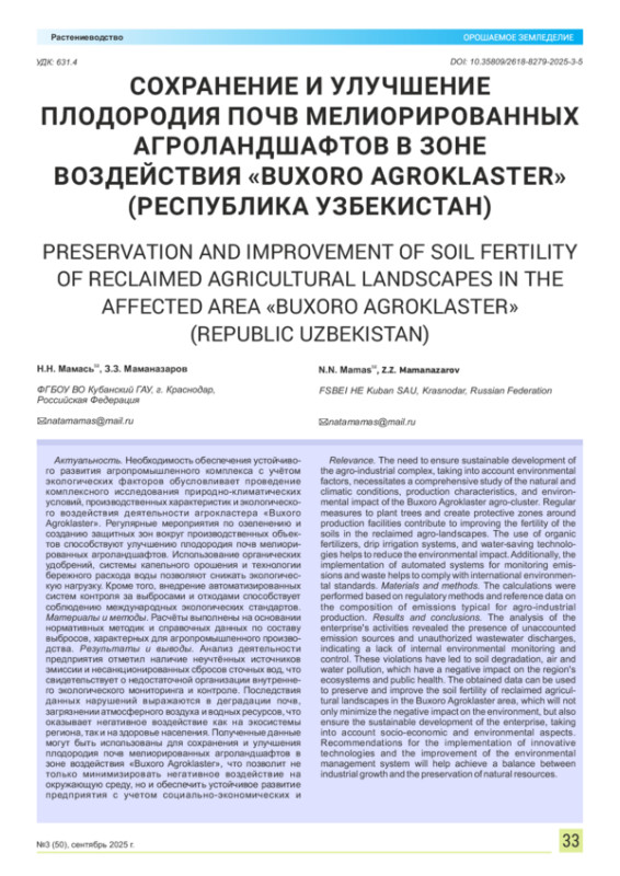 Необходимость обеспечения устойчивого развития агропромышленного комплекса с учётом экологических факторов обусловливает проведение комплексного исследования природно-климатических условий, производственных характеристик и экологического воздействия деятельности агрокластера «Buxoro Agroklaster». Регулярные мероприятия по озеленению и созданию защитных зон вокруг производственных объектов способствуют улучшению плодородия почв мелиорированных агроландшафтов. Использование органических удобрений, системы капельного орошения и технологии бережного расхода воды позволяют снижать экологическую нагрузку. Кроме того, внедрение автоматизированных систем контроля за выбросами и отходами способствует соблюдению международных экологических стандартов. Материалы и методы. Расчёты выполнены на основании нормативных методик и справочных данных по составу выбросов, характерных для агропромышленного производства. Результаты и выводы. Анализ деятельности предприятия отметил наличие неучтённых источников эмиссии и несанкционированных сбросов сточных вод, что свидетельствует о недостаточной организации внутреннего экологического мониторинга и контроле. Последствия данных нарушений выражаются в деградации почв, загрязнении атмосферного воздуха и водных ресурсов, что оказывает негативное воздействие как на экосистемы региона, так и на здоровье населения. Полученные данные могут быть использованы для сохранения и улучшения плодородия почв мелиорированных агроландшафтов в зоне воздействия «Buxoro Agroklaster», что позволит не только минимизировать негативное воздействие на окружающую среду, но и обеспечить устойчивое развитие предприятия с учетом социально-экономических и природоохранных аспектов. Рекомендации по внедрению инновационных технологий и совершенствованию системы экологического менеджмента будут способствовать достижению баланса между промышленным ростом и сохранением природных ресурсов региона.