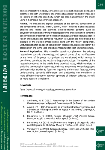 Результаты. Уточнены понятия имплицитности и эксплицитности семного состава компонентов «сердце», «cœur», «cuore», «heart», входящих во фразеологические обороты и идиомы. Установлены лексико-семантические закономерности, такие как полисемия и вариантность в рамках фразеологизмов, отмечены семантическая консервация, характерная для французского языка, частичная деактуализация в итальянском и английском языках и семантическая редукция в русском языке на примере исследуемых фразеологизмов с компонентом сердце. Установлена культурно-историческая специфика, выраженная как в сохранении, так и в утрате архаичных значений для каждой лингвокультуры.