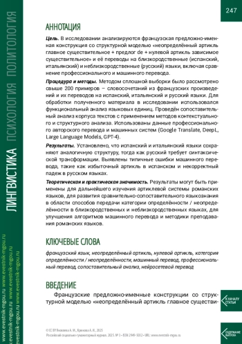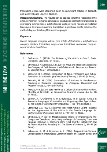 Ключевые фразы: ФРАНЦУЗСКИЙ ЯЗЫК, неопределённый артикль, нулевой артикль, категория определённости неопределённости, машинный перевод, профессиональный перевод, сопоставительный анализ, нейросетевой перевод