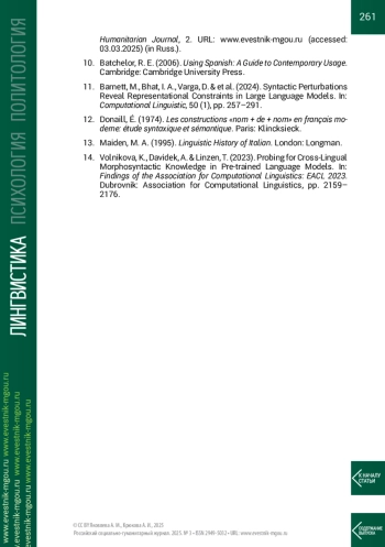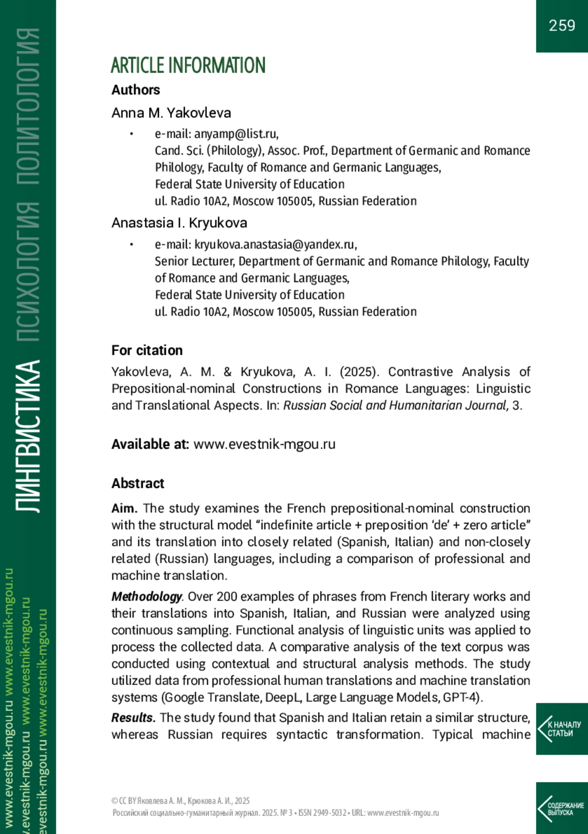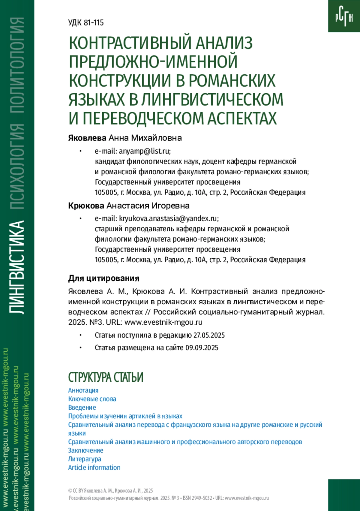 Статья: КОНТРАСТИВНЫЙ АНАЛИЗ ПРЕДЛОЖНО-ИМЕННОЙ КОНСТРУКЦИИ В РОМАНСКИХ ЯЗЫКАХ В ЛИНГВИСТИЧЕСКОМ И ПЕРЕВОДЧЕСКОМ АСПЕКТАХ (2025)