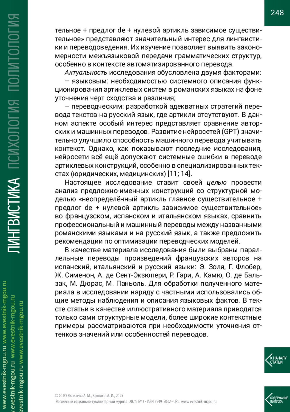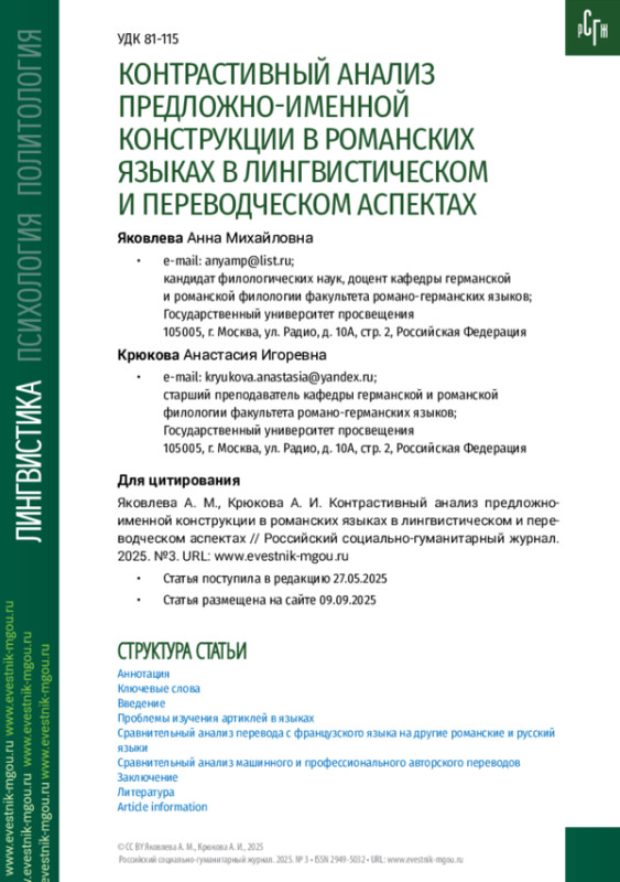 ЯКОВЛЕВА А. М., КРЮКОВА А. И. КОНТРАСТИВНЫЙ АНАЛИЗ ПРЕДЛОЖНО-ИМЕННОЙ КОНСТРУКЦИИ В РОМАНСКИХ ЯЗЫКАХ В ЛИНГВИСТИЧЕСКОМ И ПЕРЕВОДЧЕСКОМ АСПЕКТАХ // РОССИЙСКИЙ СОЦИАЛЬНО-ГУМАНИТАРНЫЙ ЖУРНАЛ. 2025. №3