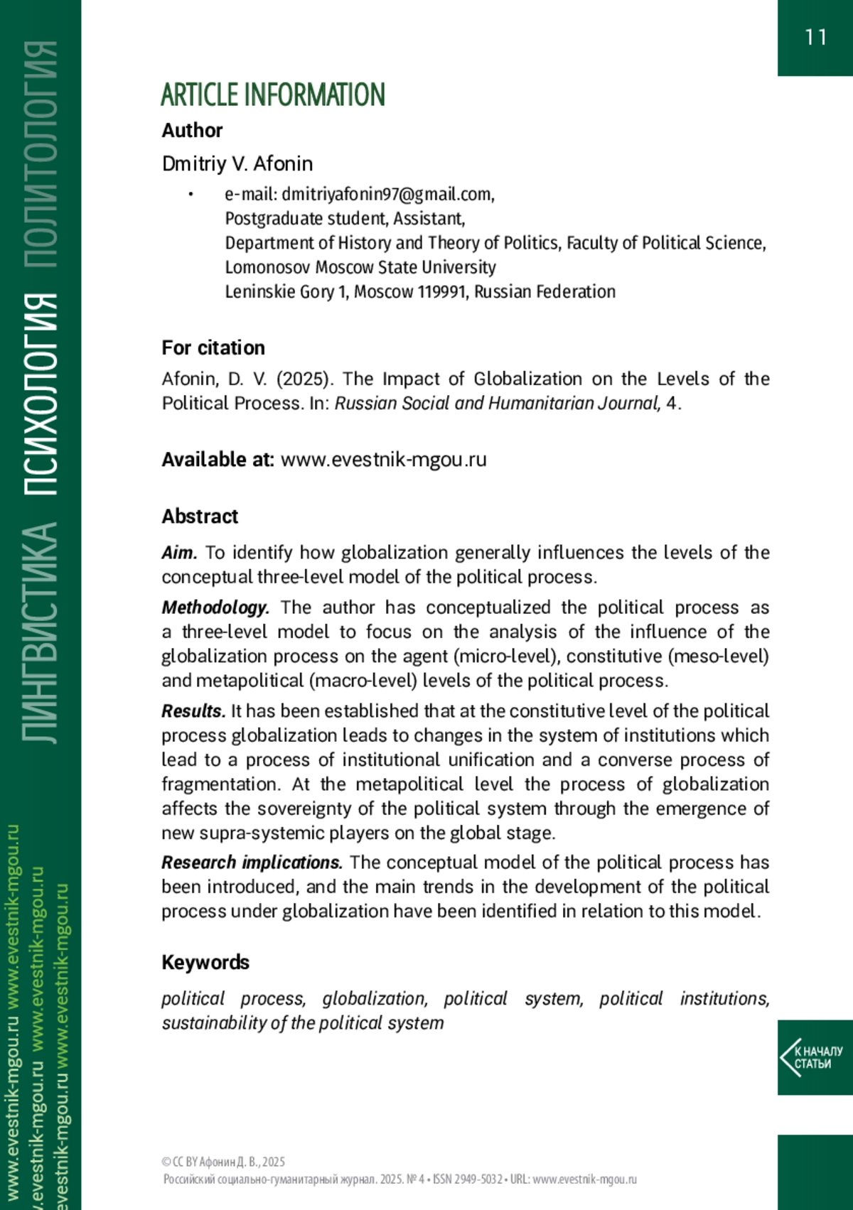 Результаты. Установлено, что на агентном уровне политического процесса влияние глобализации характеризуется через появление новых акторов, влияющих на внутриполитическую ситуацию. На конститутивном уровне политического процесса глобализация приводит к изменениям системы институтов, происходят процесс унификации институтов и обратный ему процесс фрагментации. На метаполитическом уровне процесс глобализации влияет на суверенитет политической системы при появлении новых надсистемных игроков на мировой арене.