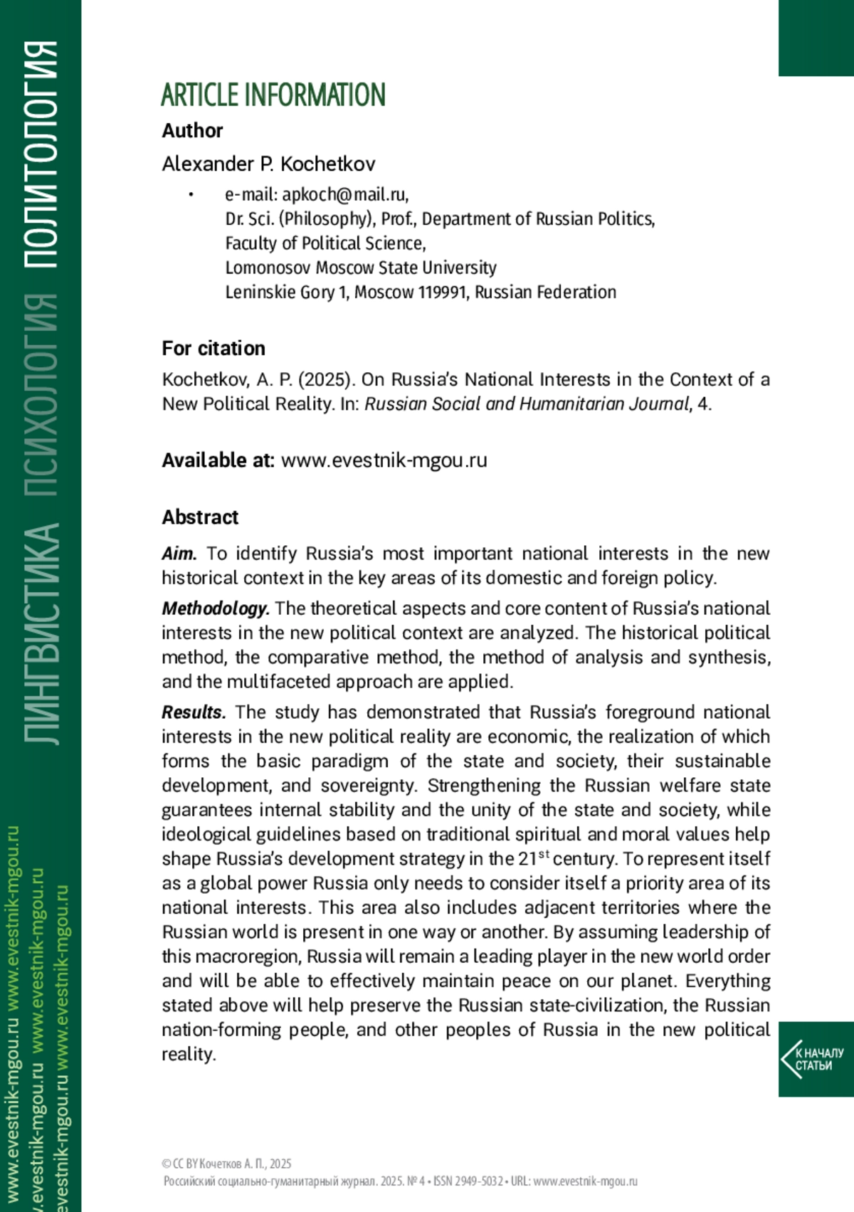 Результаты. Проведённое исследование показало, что приоритетными национальными интересами России в новой политической реальности являются экономические интересы, реализация которых создаёт базовую парадигму государства и общества, их устойчивого развития и суверенитета. Укрепление российского социального государства гарантирует внутреннюю стабильность, единство государства и общества, а идеологические ориентиры, основанные на традиционных духовно-нравственных ценностях, помогут сформировать стратегию развития России в ХХI в. Чтобы быть мировой державой, России достаточно считать приоритетной зоной своих национальных интересов саму себя. В эту зону входят и сопредельные территории, где так или иначе распространён русский мир. Встав во главе данного макрорегиона, Россия останется одним из ведущих игроков в новом миропорядке и сможет эффективно бороться за поддержание мира на нашей планете. Всё это позволит сохранить Российское государство-цивилизацию, русский государствообразующий народ и другие народы России в условиях новой политической реальности.