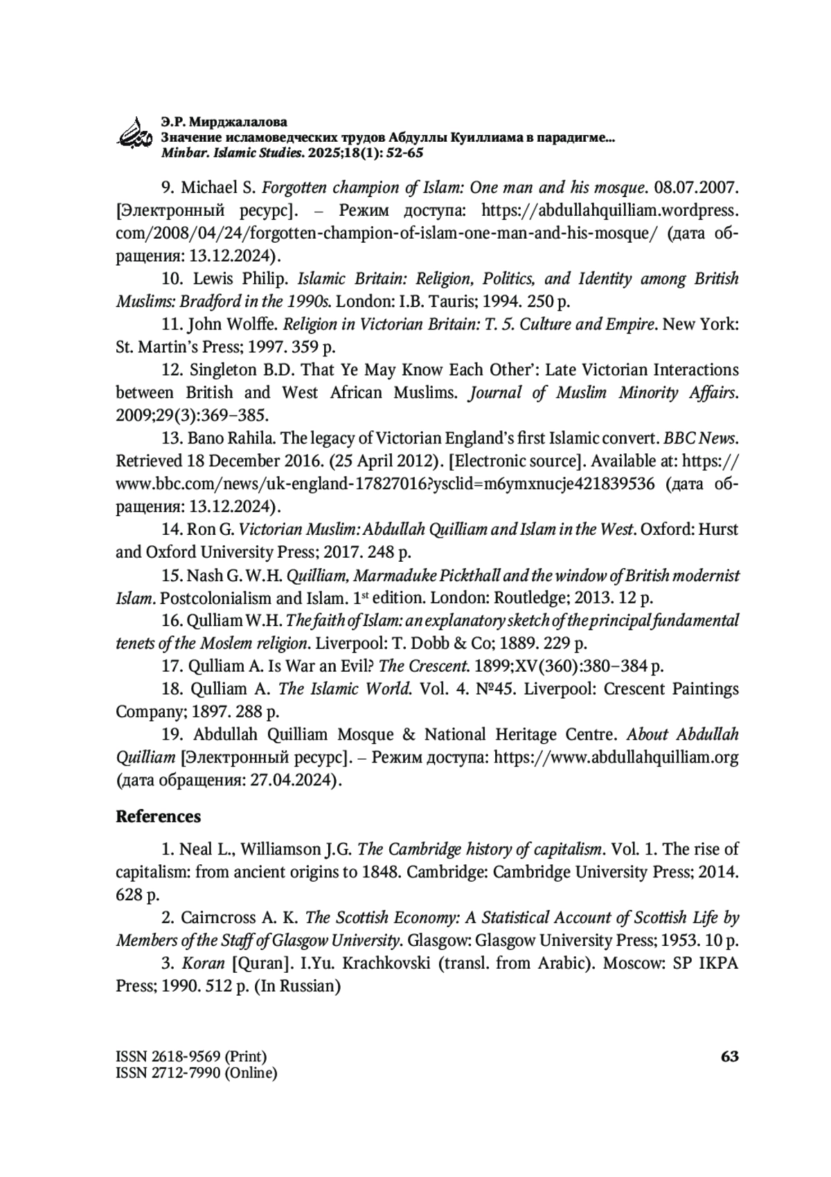 15. Nash G. W.H. Quilliam, Marmaduke Pickthall and the window of British modernist Islam. Postcolonialism and Islam. 1st edition. London: Routledge; 2013. 12 p.