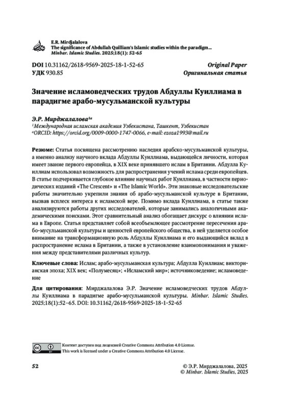 Статья посвящена рассмотрению наследия арабско-мусульманской культуры, а именно анализу научного вклада Абдуллы Куиллиама, выдающейся личности, которая имеет звание первого европейца, в XIX веке принявшего ислам в Британии. Абдулла Куиллиам использовал возможность для распространения учений ислама среди европейцев. В статье подчеркивается глубокое влияние научных работ Куиллиама, в частности периодических изданий «The Crescent» и «The Islamic World». Эти знаковые исследовательские работы значительно укрепили знания об арабо-мусульманской культуре в Британии, вызвав всплеск интереса к исламской вере. Помимо вклада Куиллиама, в статье также анализируются работы других исследователей, которые занимались аналогичными академическими поисками. Этот сравнительный анализ обогащает дискурс о влиянии ислама в Европе. Статья представляет собой всеобъемлющее рассмотрение пересечения арабо-мусульманской культуры и ценностей европейского общества, в ней уделяется особое внимание на трансформационную роль Абдуллы Куиллиама и его выдающийся вклад в распространение ислама в Британии, а также в установление взаимопонимания и уважения между представителями различных культур.