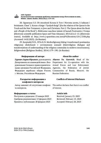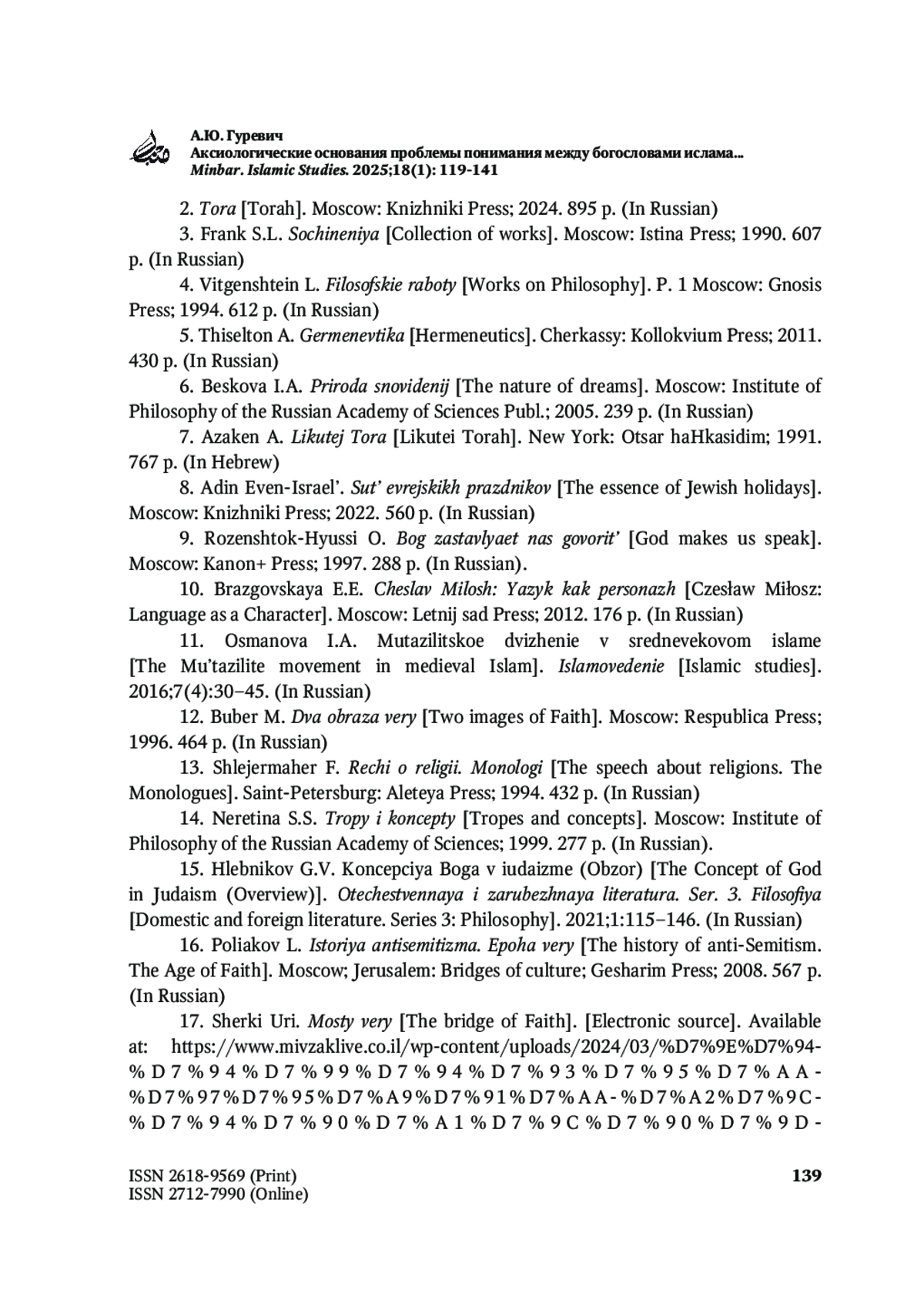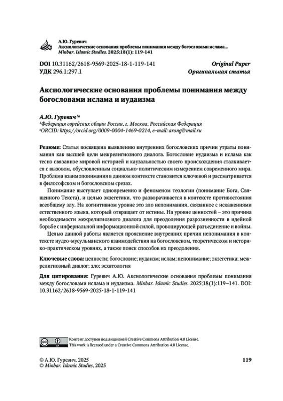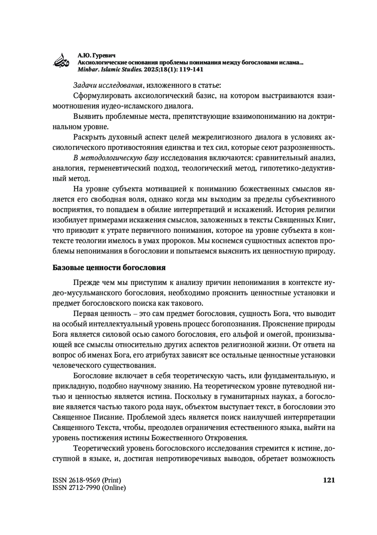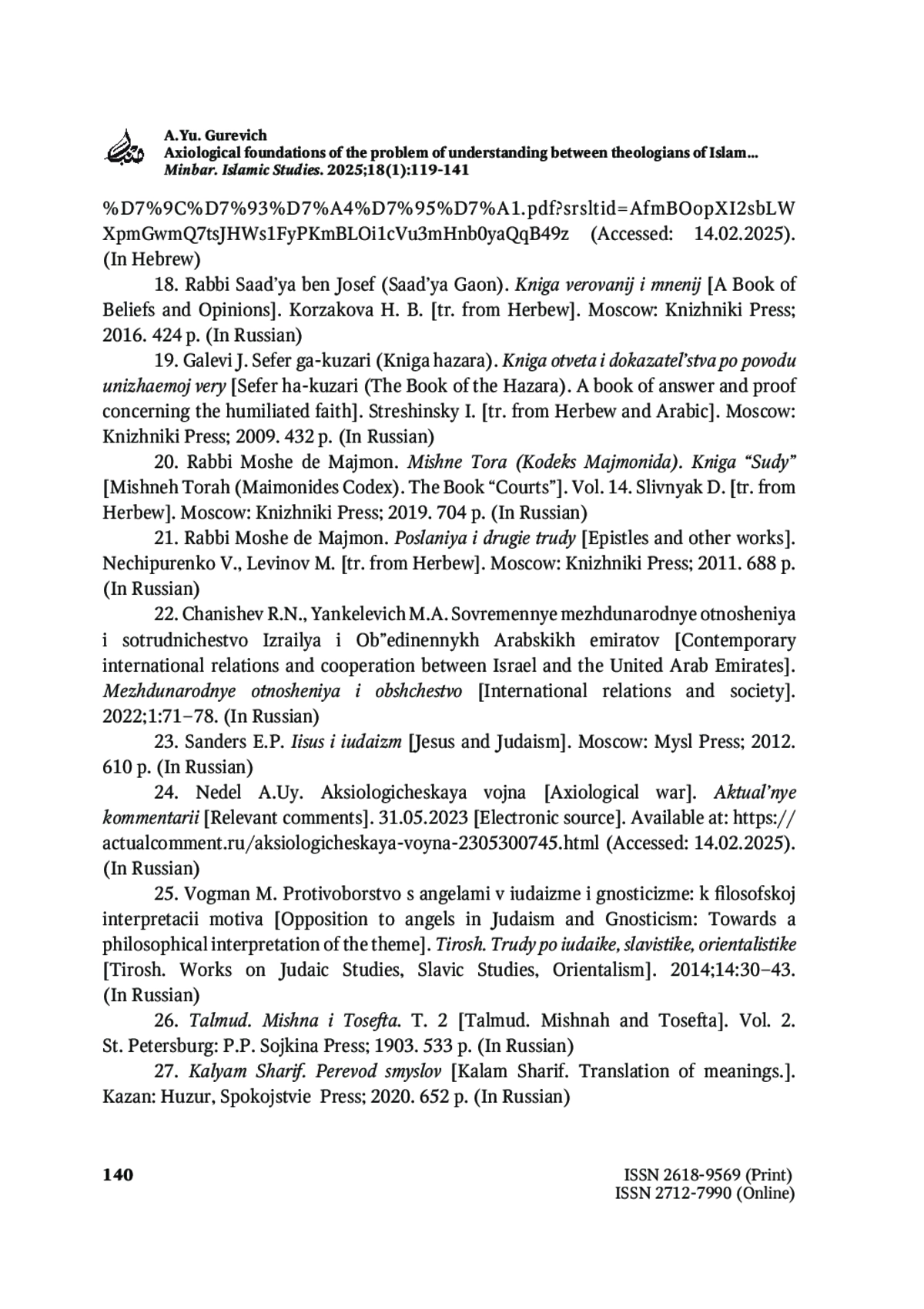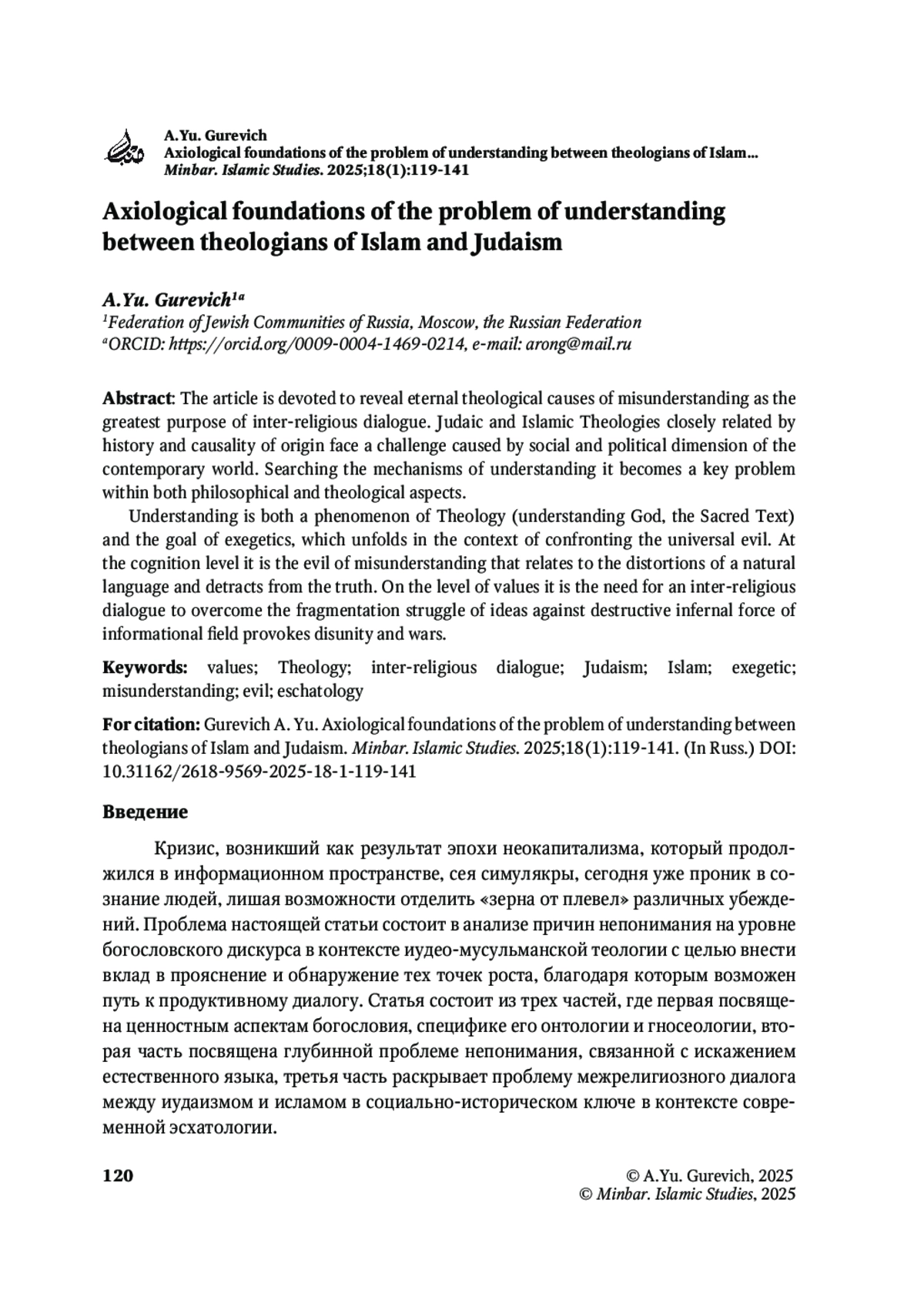 ГУРЕВИЧ А. Ю. АКСИОЛОГИЧЕСКИЕ ОСНОВАНИЯ ПРОБЛЕМЫ ПОНИМАНИЯ МЕЖДУ БОГОСЛОВАМИ ИСЛАМА И ИУДАИЗМА // MINBAR. ISLAMIC STUDIES. 2025. № 1, ТОМ 18