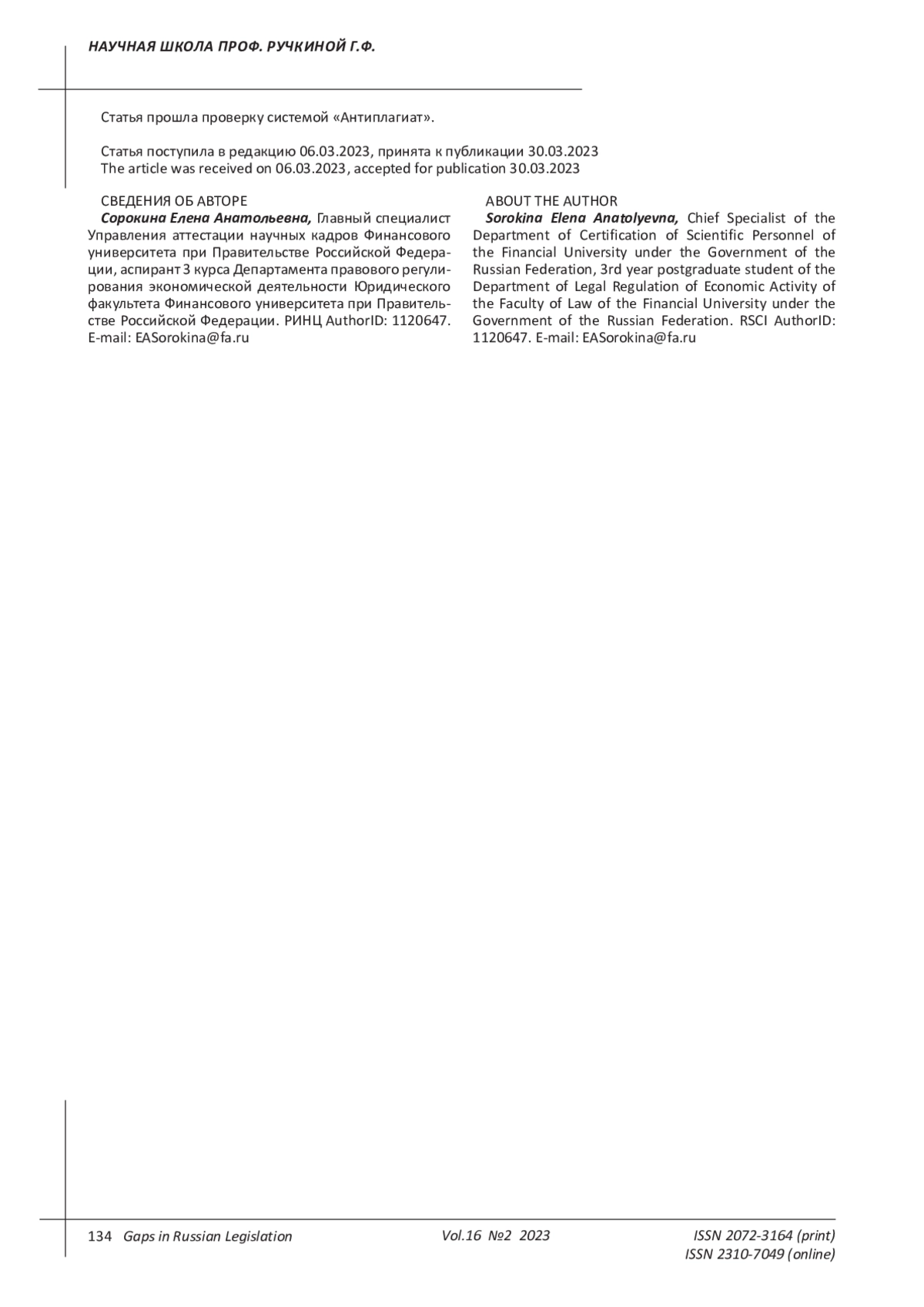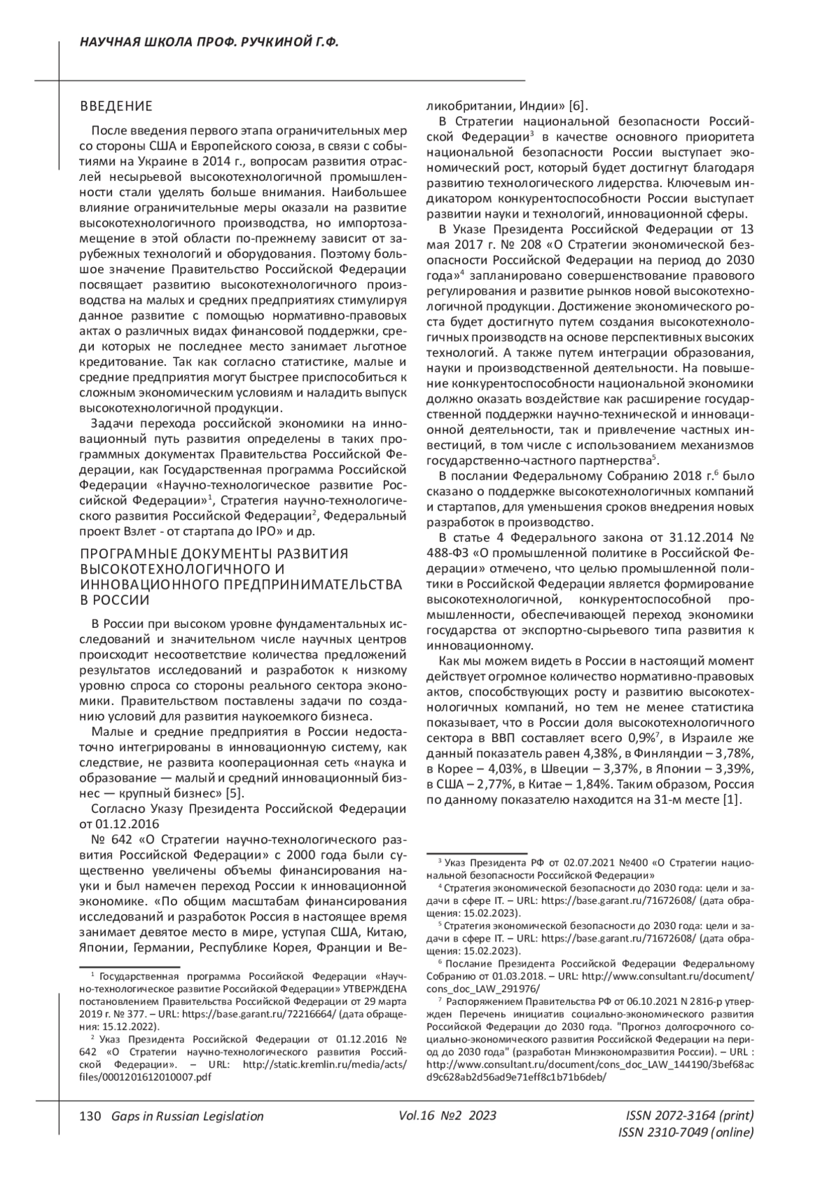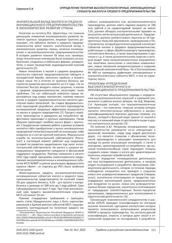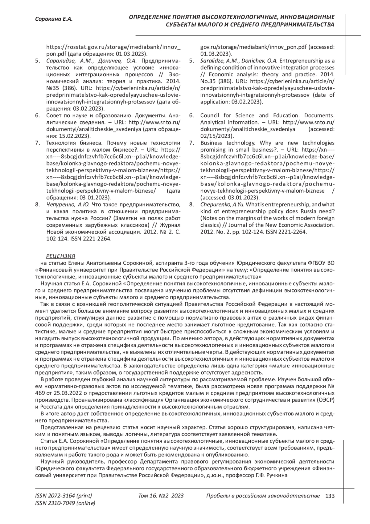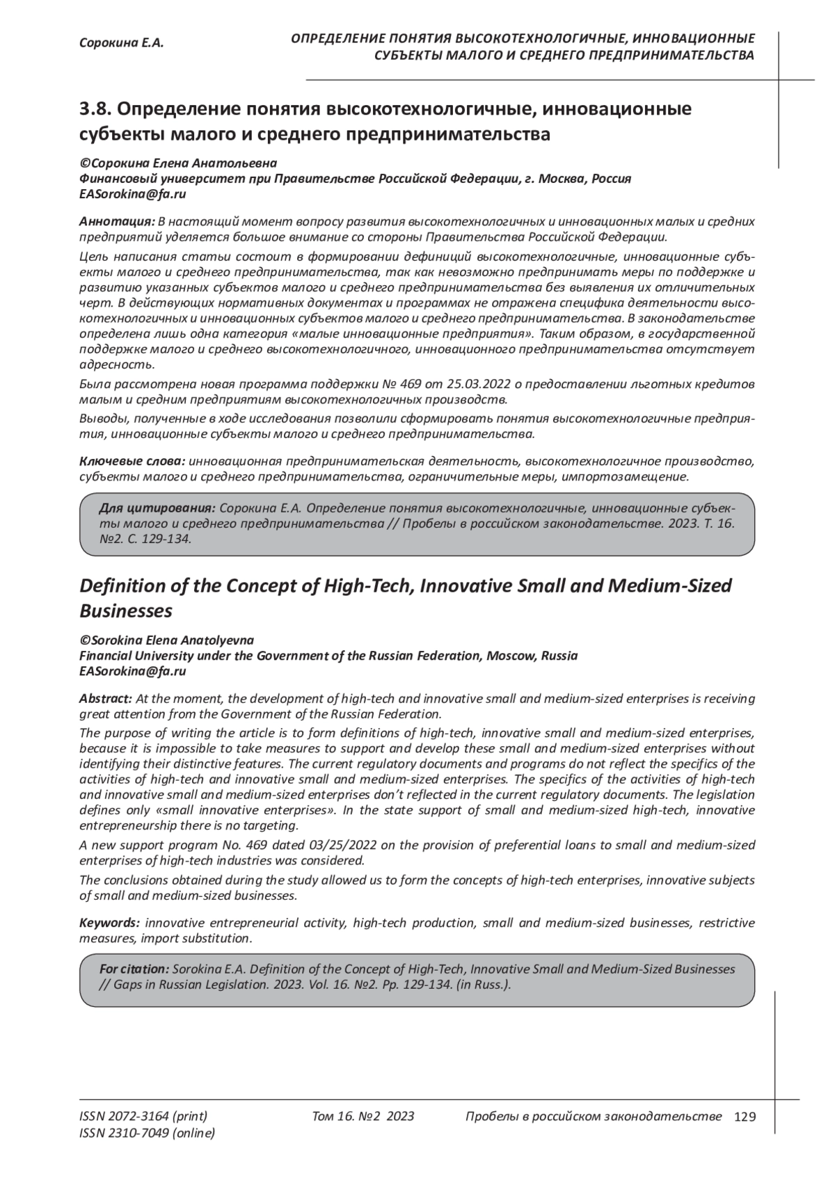 СОРОКИНА Е. А. ОПРЕДЕЛЕНИЕ ПОНЯТИЯ ВЫСОКОТЕХНОЛОГИЧНЫЕ, ИННОВАЦИОННЫЕ СУБЪЕКТЫ МАЛОГО И СРЕДНЕГО ПРЕДПРИНИМАТЕЛЬСТВА // ПРОБЕЛЫ В РОССИЙСКОМ ЗАКОНОДАТЕЛЬСТВЕ. 2023. Т. 16 № 2