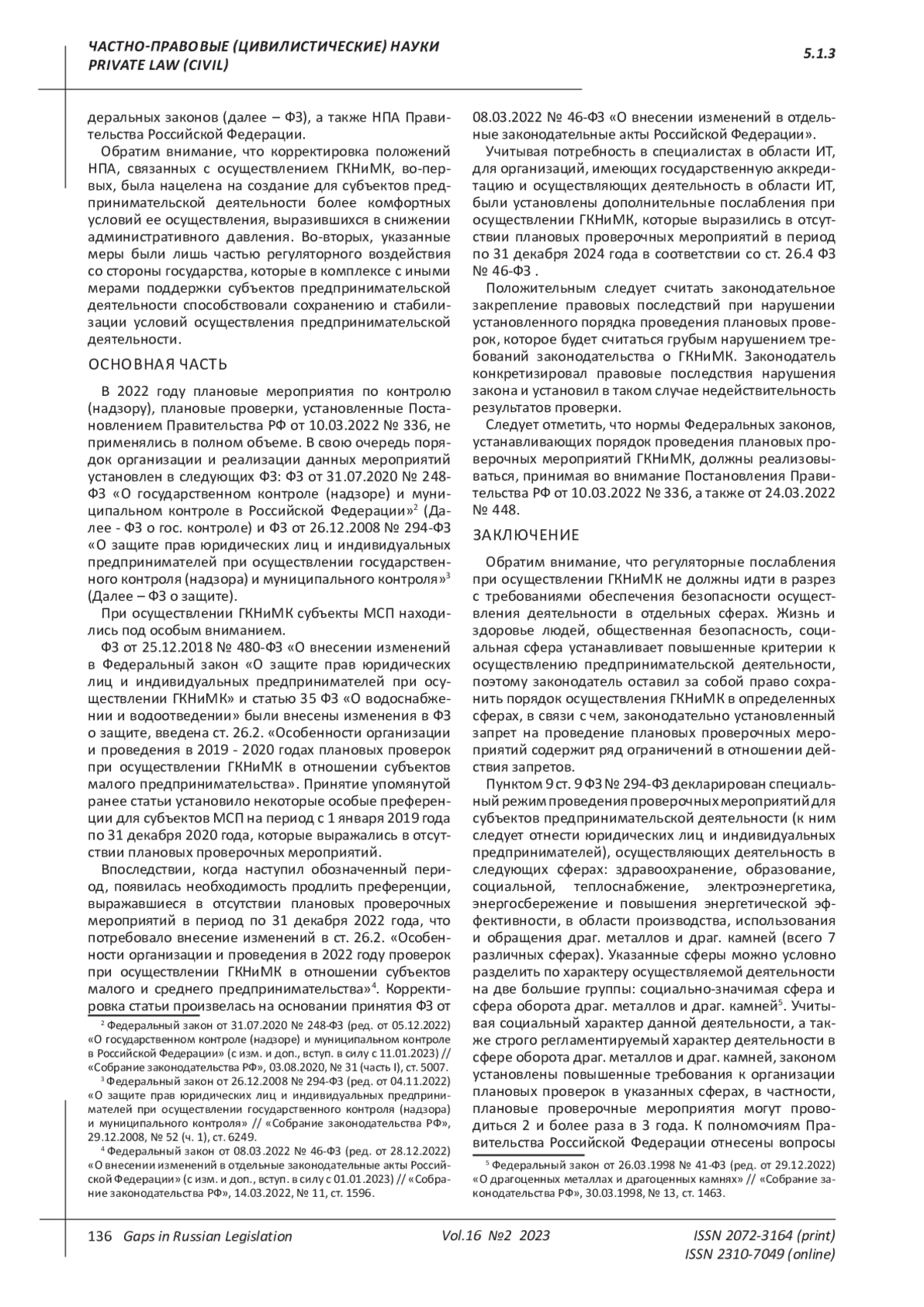 В 2022 году плановые мероприятия по контролю (надзору), плановые проверки, установленные Постановлением Правительства РФ от 10.03.2022 № 336, не применялись в полном объеме. В свою очередь порядок организации и реализации данных мероприятий установлен в следующих ФЗ: ФЗ от 31.07.2020 № 248- ФЗ «О государственном контроле (надзоре) и муниципальном контроле в Российской Федерации»2 (Далее - ФЗ о гос. контроле) и ФЗ от 26.12.2008 № 294-ФЗ «О защите прав юридических лиц и индивидуальных предпринимателей при осуществлении государственного контроля (надзора) и муниципального контроля»3 (Далее – ФЗ о защите).
