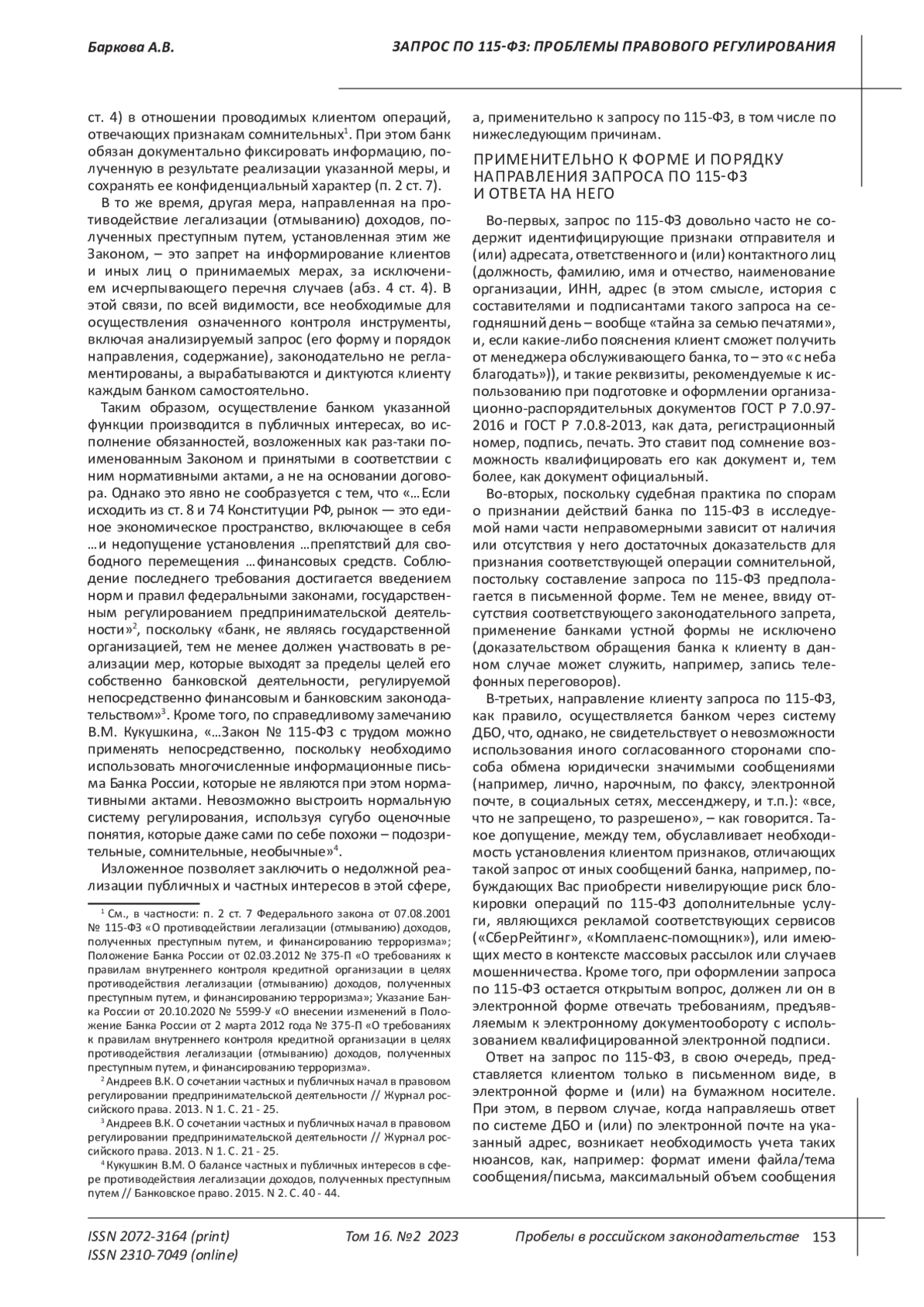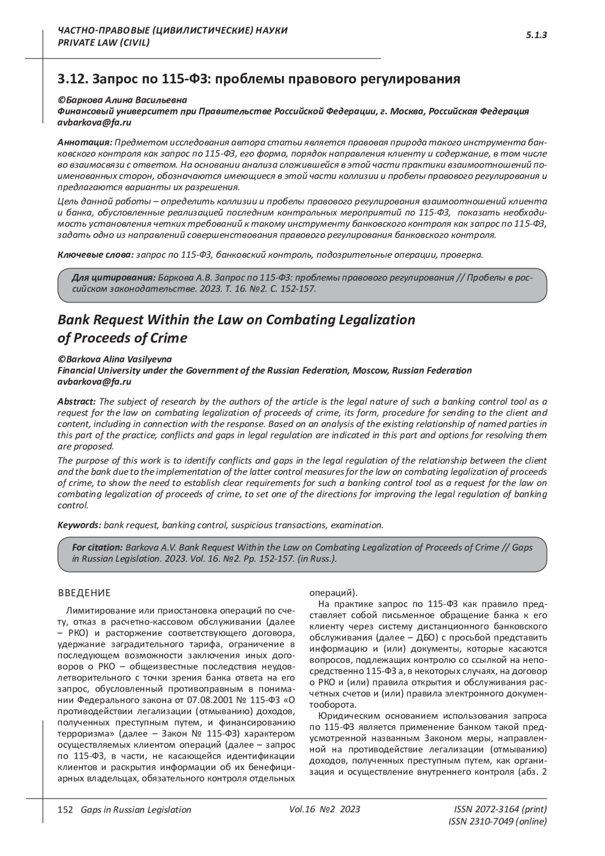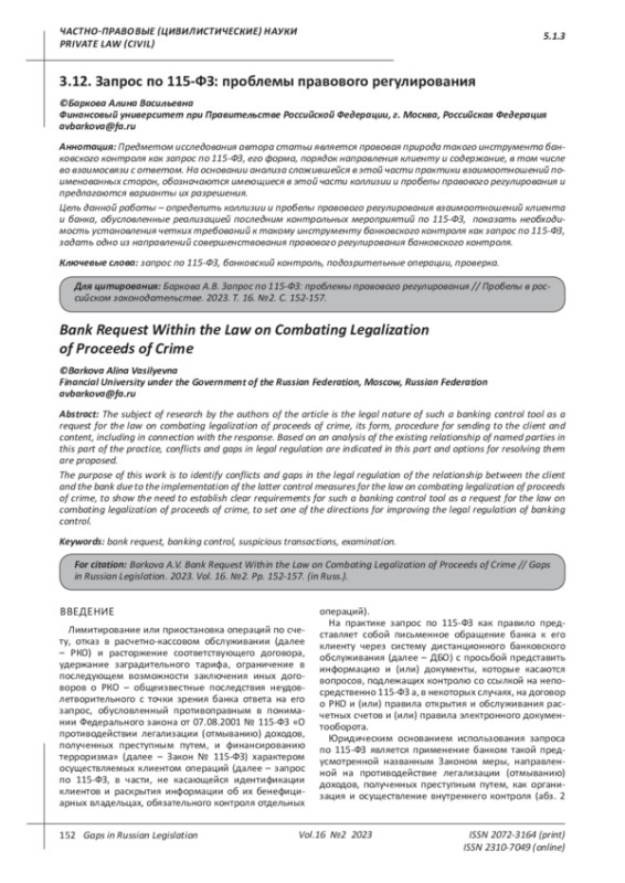 Предметом исследования автора статьи является правовая природа такого инструмента банковского контроля как запрос по 115-ФЗ, его форма, порядок направления клиенту и содержание, в том числе во взаимосвязи с ответом. На основании анализа сложившейся в этой части практики взаимоотношений поименованных сторон, обозначаются имеющиеся в этой части коллизии и пробелы правового регулирования и предлагаются варианты их разрешения. Цель данной работы - определить коллизии и пробелы правового регулирования взаимоотношений клиента и банка, обусловленные реализацией последним контрольных мероприятий по 115-ФЗ, показать необходимость установления четких требований к такому инструменту банковского контроля как запрос по 115-ФЗ, задать одно из направлений совершенствования правового регулирования банковского контроля.