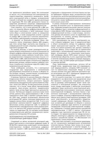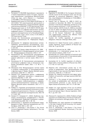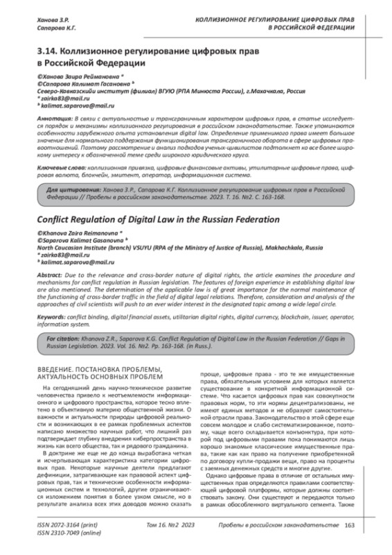 ХАНОВА З. Р., САПАРОВА К. Г. КОЛЛИЗИОННОЕ РЕГУЛИРОВАНИЕ ЦИФРОВЫХ ПРАВ В РОССИЙСКОЙ ФЕДЕРАЦИИ // ПРОБЕЛЫ В РОССИЙСКОМ ЗАКОНОДАТЕЛЬСТВЕ. 2023. Т. 16 № 2