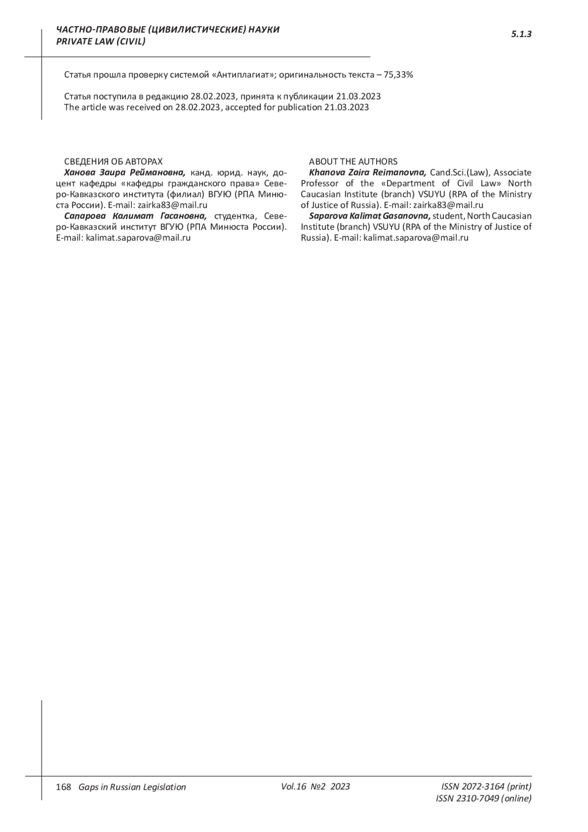 Журнал: ПРОБЕЛЫ В РОССИЙСКОМ ЗАКОНОДАТЕЛЬСТВЕ