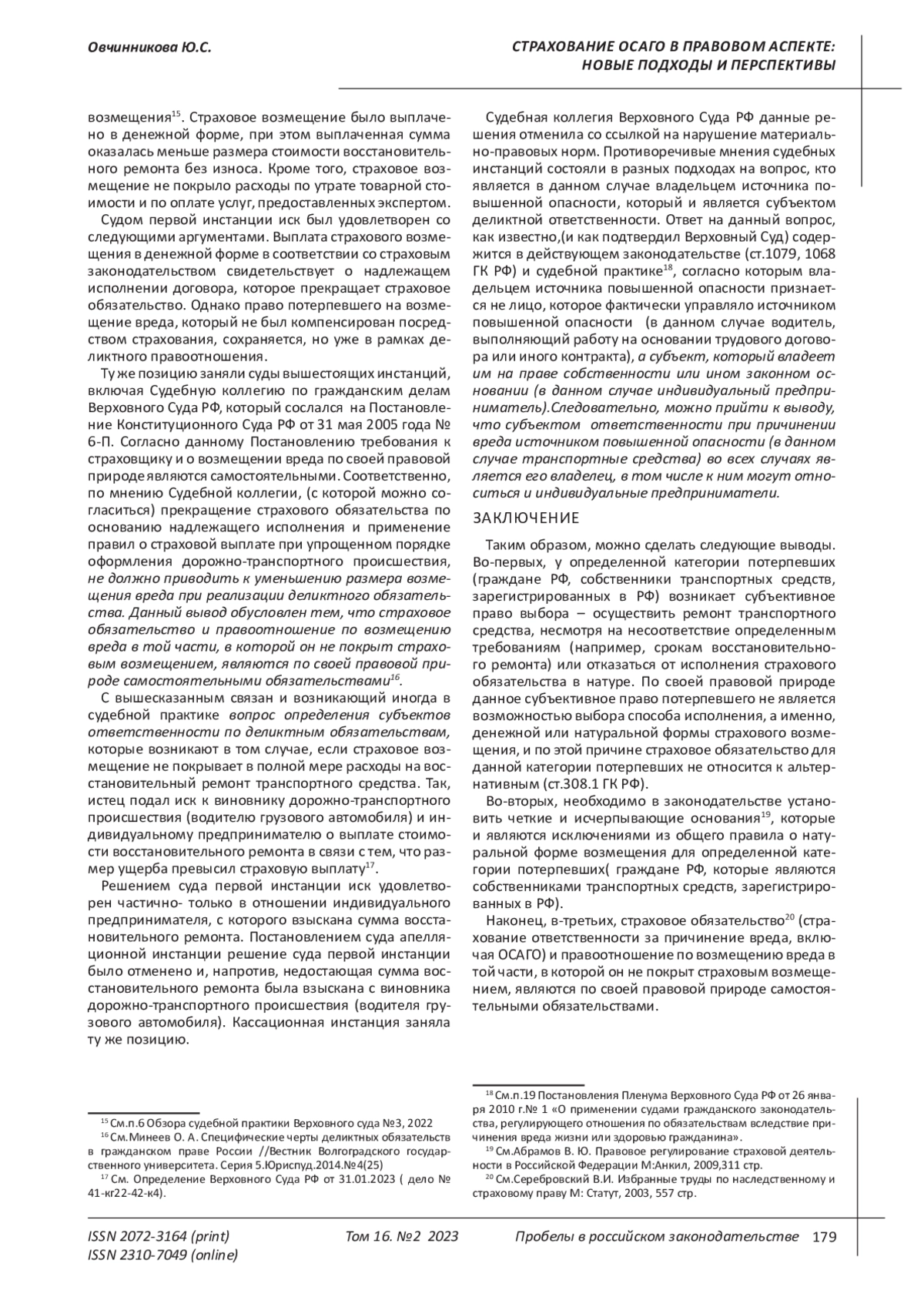 5. Копылкова Н. М. Правовые аспекты обязательного страхования гражданской ответственности владельцев транспортных средств. Диссертация на соискание ученой степени кандидата юридических наук. Москва, 2006. EDN: NNVFHZ