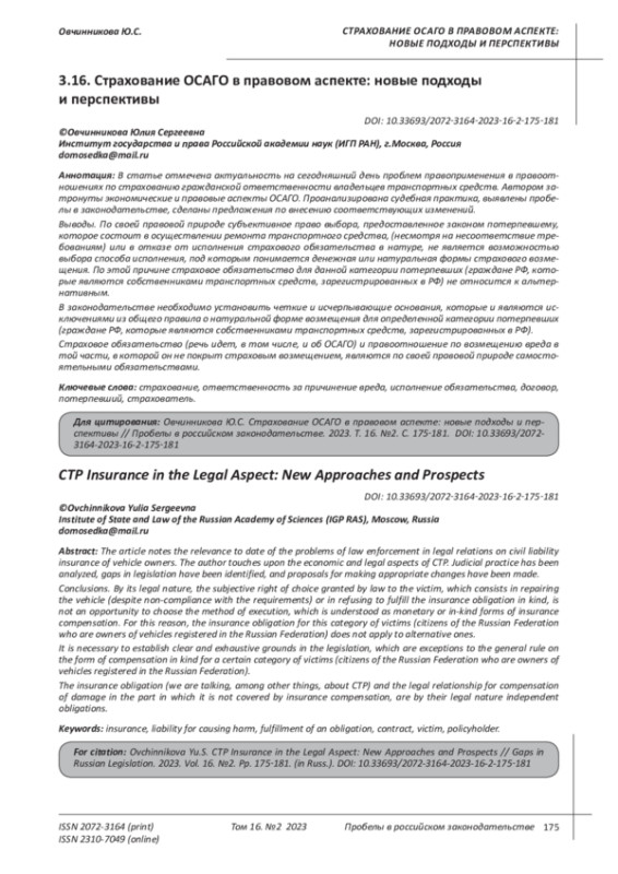 В статье отмечена актуальность на сегодняшний день проблем правоприменения в правоотношениях по страхованию гражданской ответственности владельцев транспортных средств. Автором затронуты экономические и правовые аспекты ОСАГО. Проанализирована судебная практика, выявлены пробелы в законодательстве, сделаны предложения по внесению соответствующих изменений. Выводы. По своей правовой природе субъективное право выбора, предоставленное законом потерпевшему, которое состоит в осуществлении ремонта транспортного средства, (несмотря на несоответствие требованиям) или в отказе от исполнения страхового обязательства в натуре, не является возможностью выбора способа исполнения, под которым понимается денежная или натуральная формы страхового возмещения. По этой причине страховое обязательство для данной категории потерпевших (граждане РФ, которые являются собственниками транспортных средств, зарегистрированных в РФ) не относится к альтернативным. В законодательстве необходимо установить четкие и исчерпывающие основания, которые и являются исключениями из общего правила о натуральной форме возмещения для определенной категории потерпевших (граждане РФ, которые являются собственниками транспортных средств, зарегистрированных в РФ). Страховое обязательство (речь идет, в том числе, и об ОСАГО) и правоотношение по возмещению вреда в той части, в которой он не покрыт страховым возмещением, являются по своей правовой природе самостоятельными обязательствами.