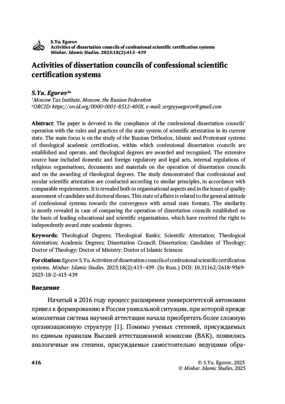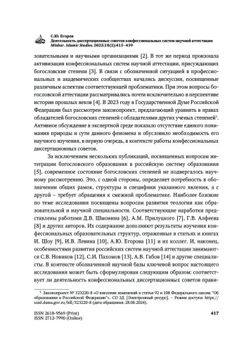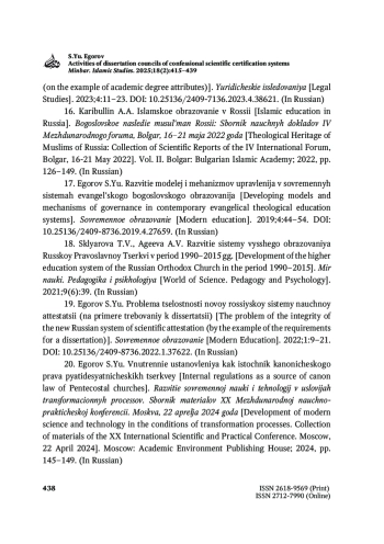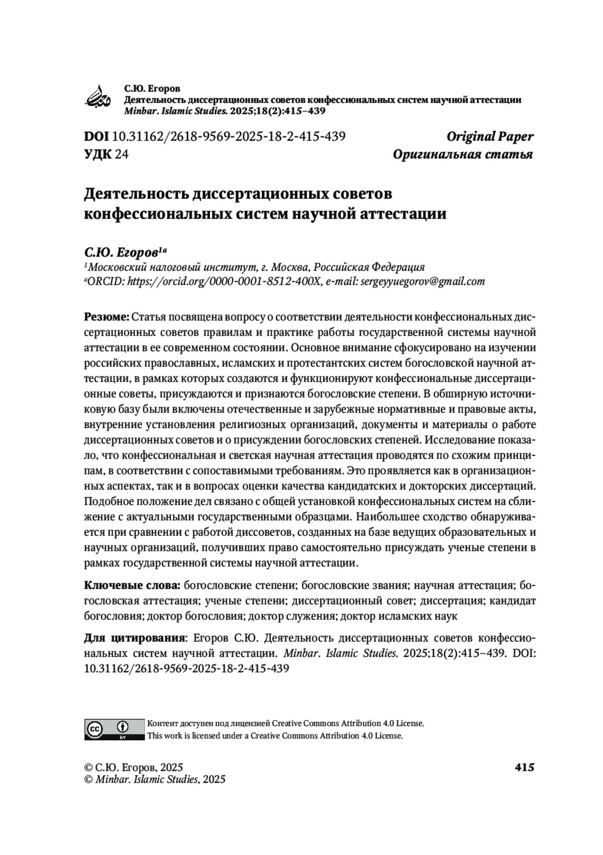 ЕГОРОВ С. Ю. ДЕЯТЕЛЬНОСТЬ ДИССЕРТАЦИОННЫХ СОВЕТОВ КОНФЕССИОНАЛЬНЫХ СИСТЕМ НАУЧНОЙ АТТЕСТАЦИИ // MINBAR. ISLAMIC STUDIES. 2025. № 1, ТОМ 18