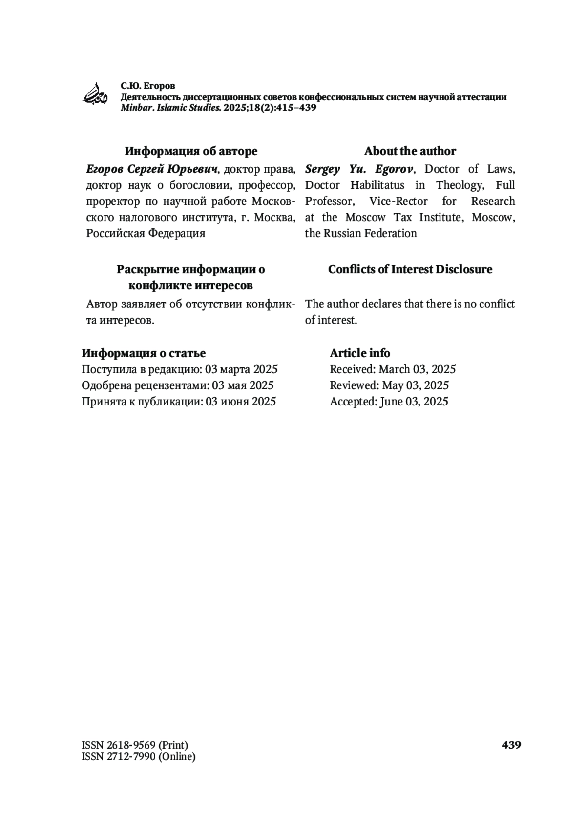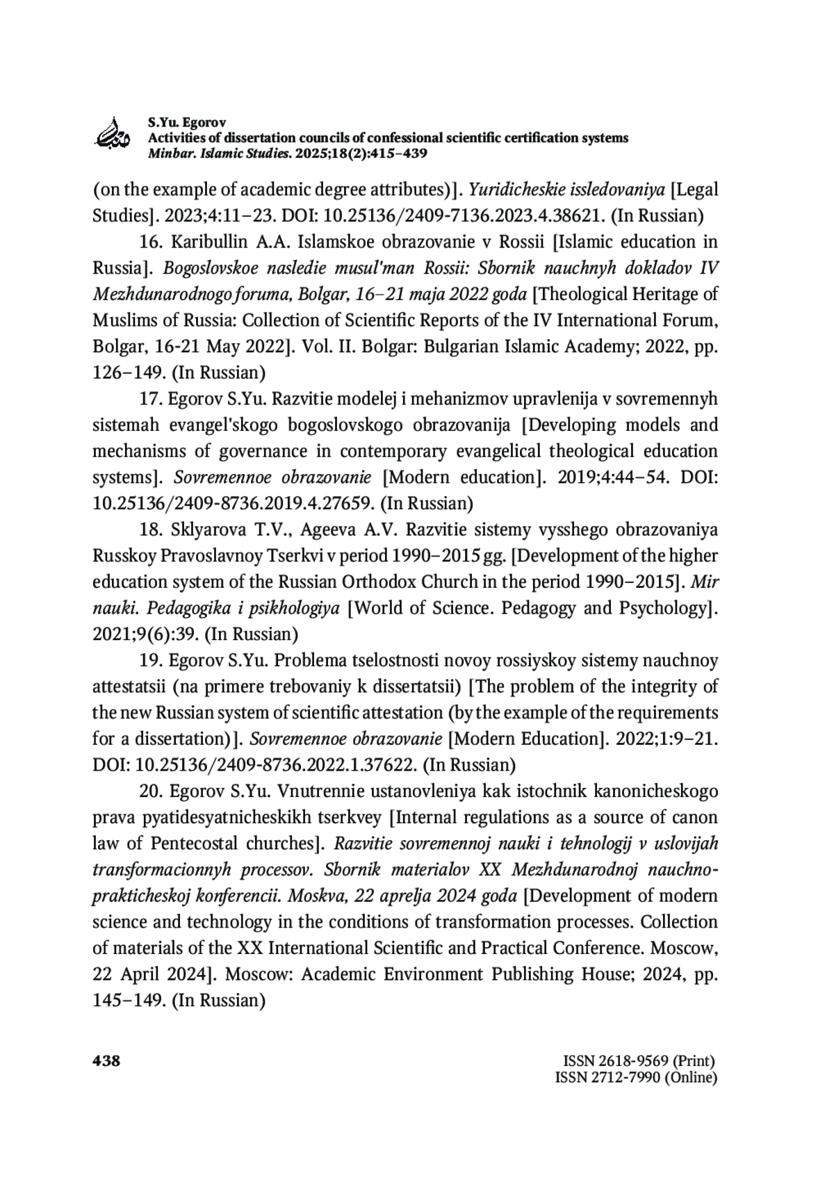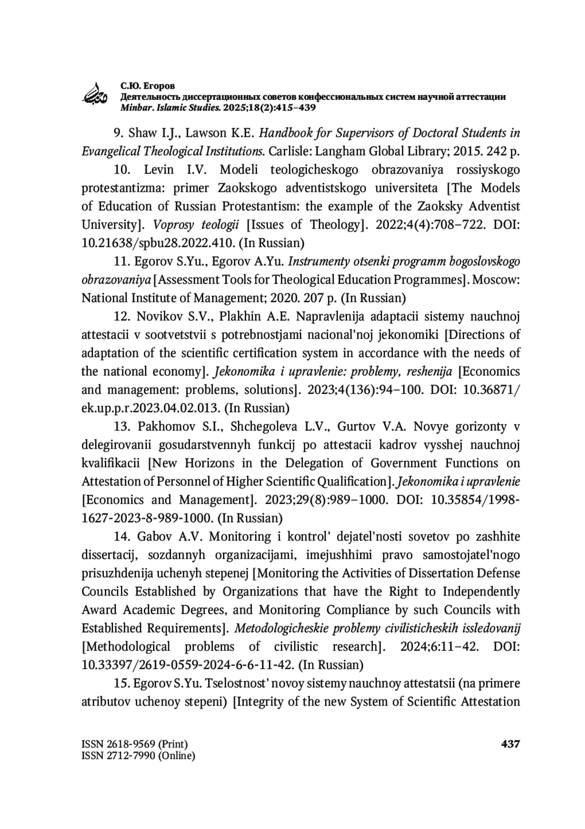 ЕГОРОВ С. Ю. ДЕЯТЕЛЬНОСТЬ ДИССЕРТАЦИОННЫХ СОВЕТОВ КОНФЕССИОНАЛЬНЫХ СИСТЕМ НАУЧНОЙ АТТЕСТАЦИИ // MINBAR. ISLAMIC STUDIES. 2025. № 1, ТОМ 18