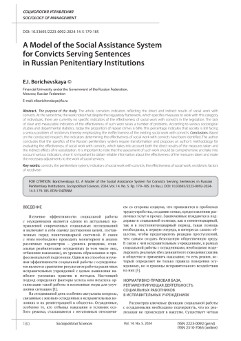 Цель исследования. В статье рассматриваются показатели, отражающие прямые и косвенные результаты социальной работы с осужденными. Вместе с тем, в работе отмечается, что несмотря на нормативно-правовую базу, в которой указаны мероприятия по работе с данной категорией индивидов, в настоящее время в законодательстве отсутствуют конкретные показатели эффективности социальной работы с осужденными. Отсутствие четких и измеримых показателей эффективности такой работы порождает ряд проблем. Как показывают различные социологические исследования и ведомственная статистика, на сегодняшний день доля повторных преступлений составляет 68%. Такой процент указывает на то, что общество до сих пор сталкивается с серьезной проблемой рецидива, тем самым подчеркивая не эффективность сложившейся социальной работы с осужденными. Выводы. На основе проведенного исследования выявлены показатели, определяющие эффективность социальной работы с осужденными. Автор делает вывод, что специфика российской пенитенциарной системы требует трансформации и предлагает авторскую методику оценки эффективности социальной работы с осужденными, которая учитывает как прямые результаты проводимых мер, так и косвенные эффекты ресоциализации. Важно отметить, что оценка такой работы должна быть комплексной и учитывать различные показатели, поскольку важно получить достоверную информацию о результативности проводимых мер и внести необходимые коррективы в работу социальных служб.
