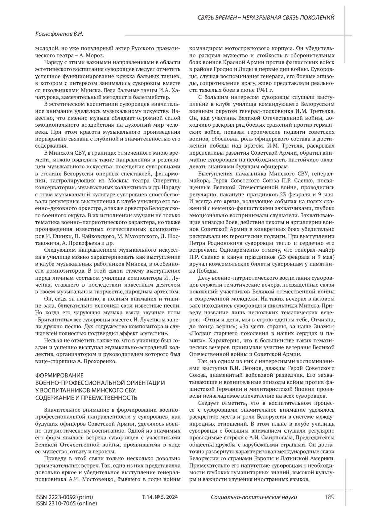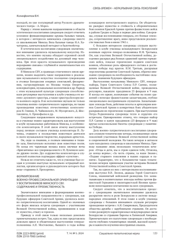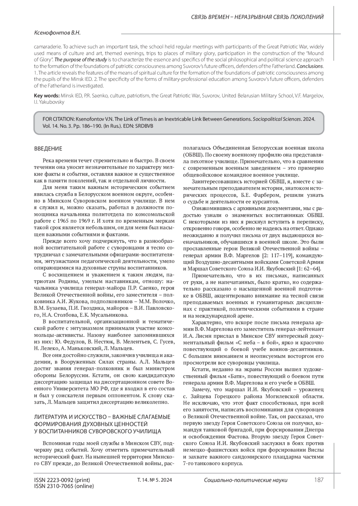 В статье на основе принципа единства исторического и логического раскрывается содержание и специфика идейно-воспитательной работы среди суворовцев в Минском СВУ в конце 1960-х гг. При этом характер и направленность деятельности воспитательного процесса концентрировались на формировании у суворовцев высоких духовных качеств: долга, чести и достоинства, товарищества. Для достижения такой важной задачи в училище проводились регулярные встречи с участниками Великой Отечественной войны, широко использовались средства культуры и искусства, тематические вечера, походы по местам боевой славы, участие в строительстве «Кургана Славы». Цель исследования: охарактеризовать сущность и специфику социального философского и политологического подхода к формированию основ патриотического сознания у суворовцев - будущих офицеров, защитников Отечества. Выводы. 1. В статье раскрываются особенности средств духовной культуры по формированию основ патриотического сознания у воспитанников Минского СВУ. 2. Исследуется специфика форм военно-профессионального воспитания у суворовцев - будущих офицеров, защитников Отечества.