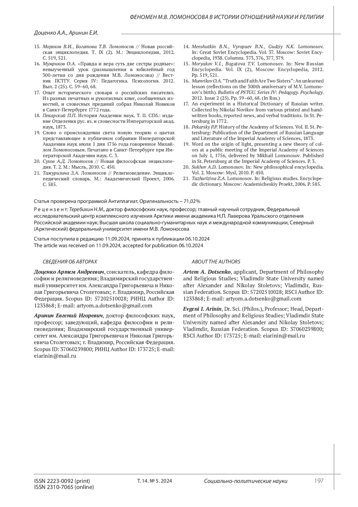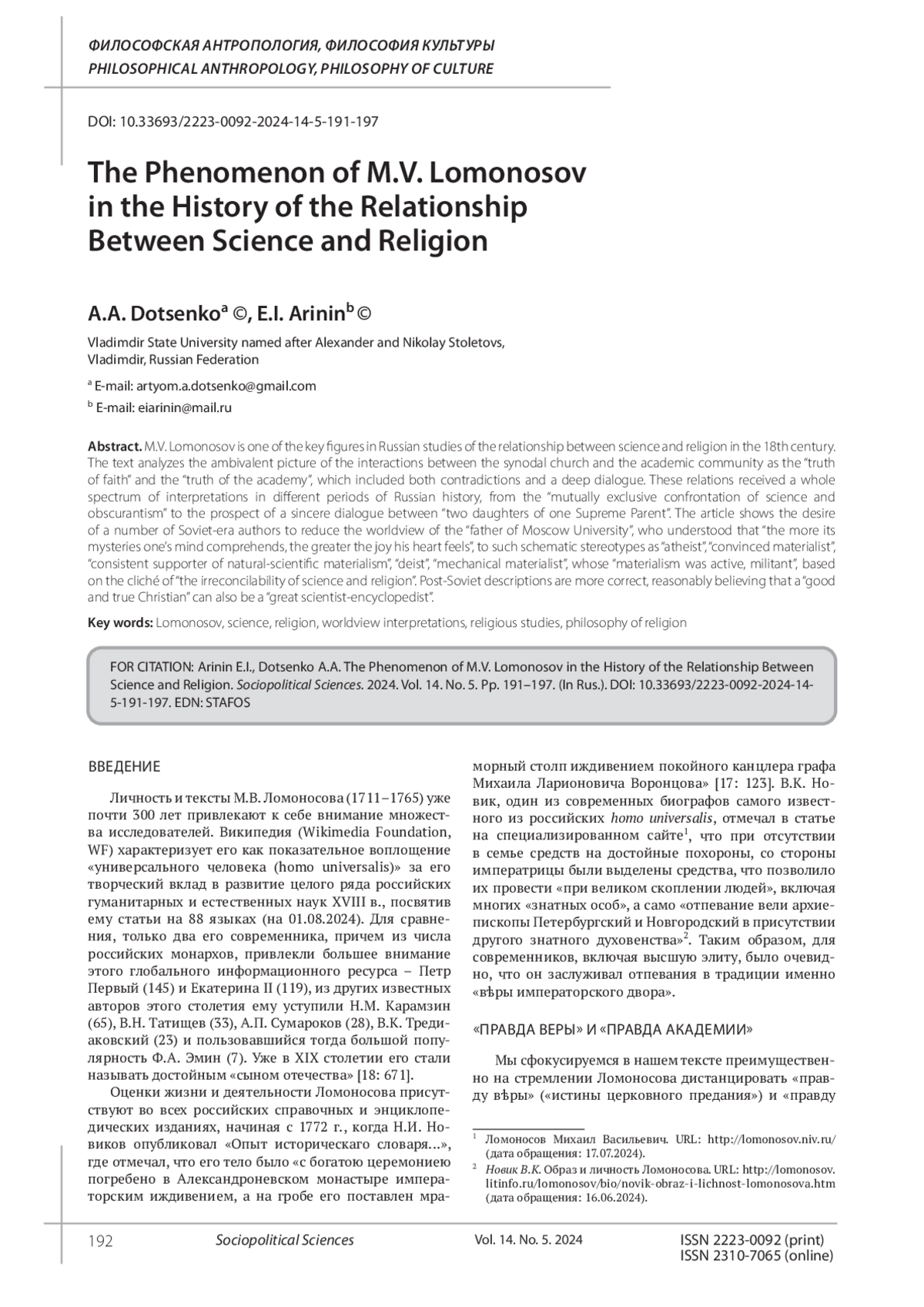 Arinin E.I. Orthodoxy and science (based on the work of M.V. Lomonosov). In: State. Society. Church: Proceedings of the international scientific conference (Vladimir, November 18, 2020). Vladimir: Arkaim, 2020. Pp. 105-119.