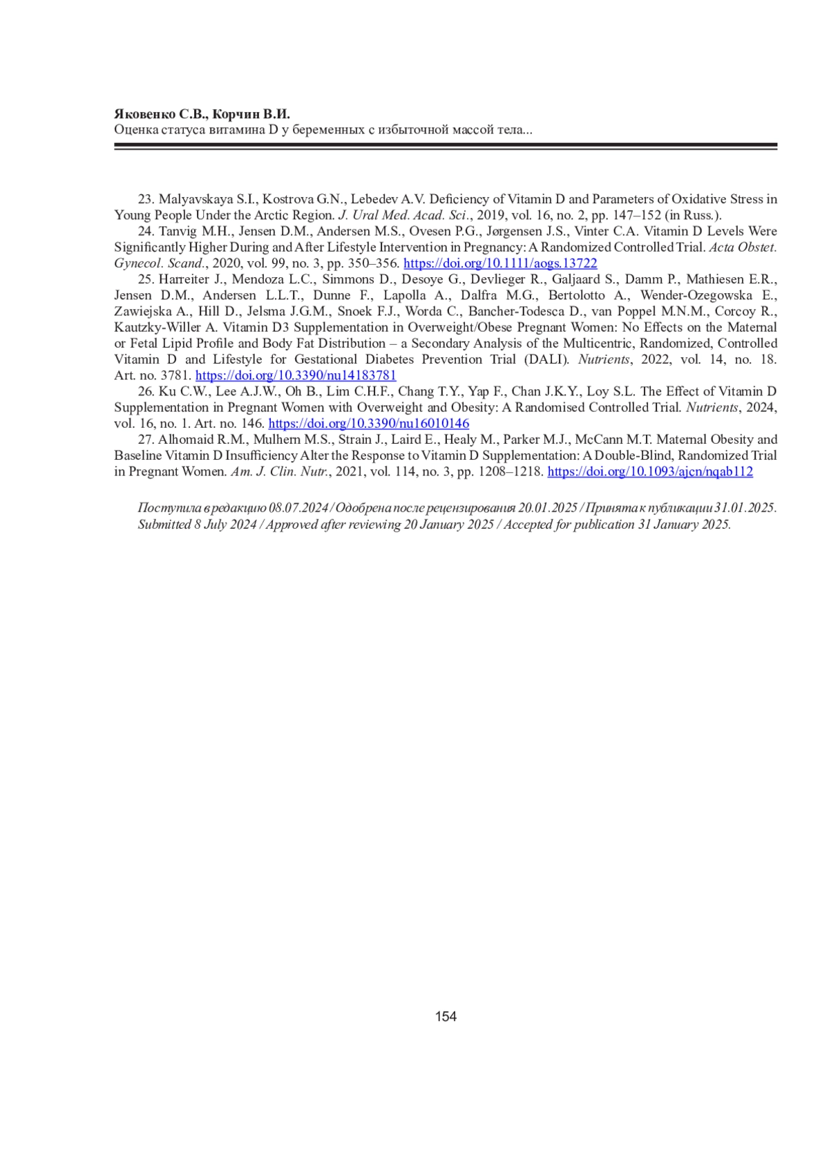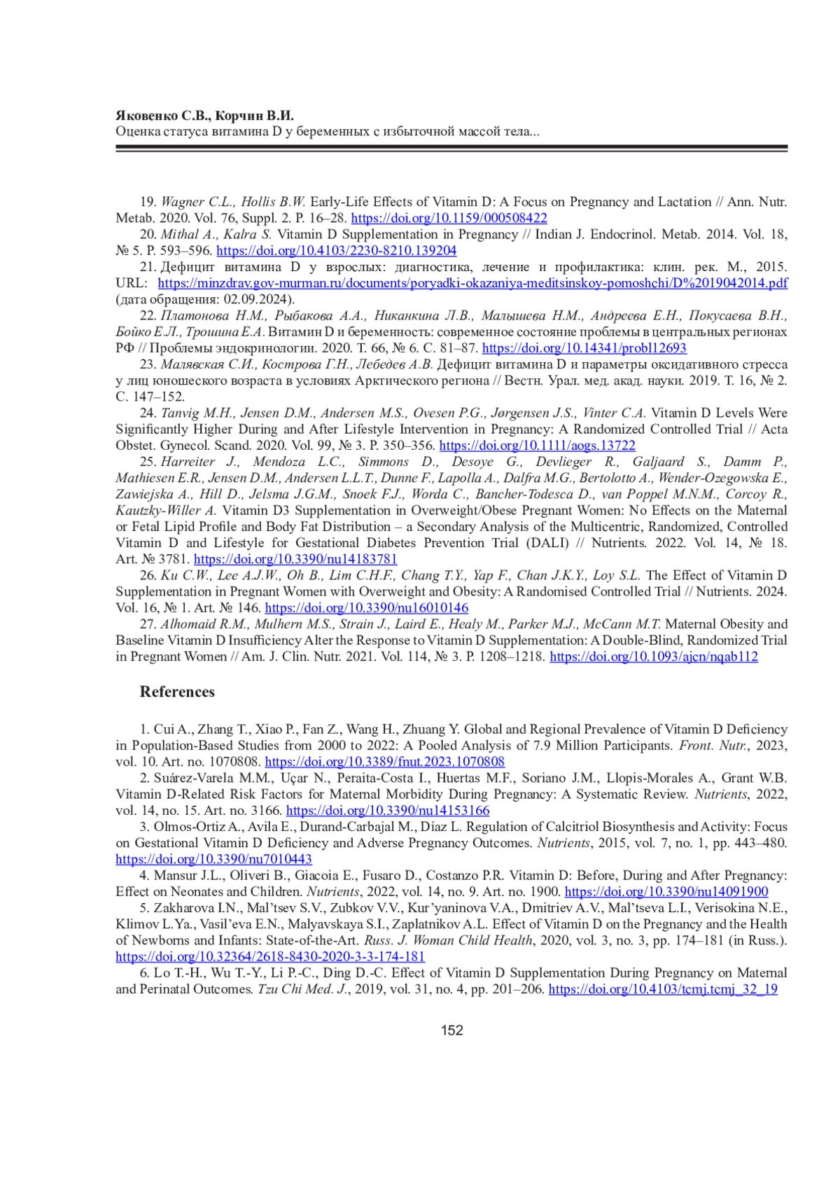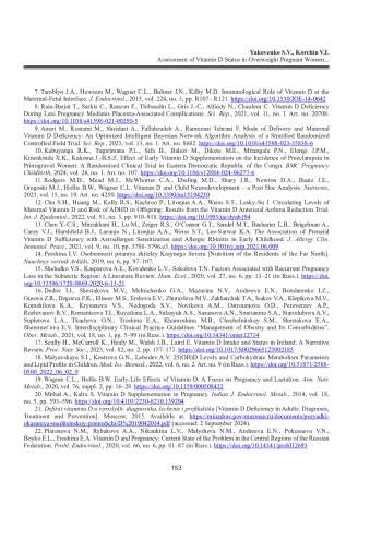 27. Alhomaid R.M., Mulhern M.S., Strain J., Laird E., Healy M., Parker M.J., McCann M.T. Maternal Obesity and Baseline Vitamin D Insufficiency Alter the Response to Vitamin D Supplementation: A Double-Blind, Randomized Trial in Pregnant Women // Am. J. Clin. Nutr. 2021. Vol. 114, No 3. P. 1208-1218. DOI: 10.1093/ajcn/nqab112 EDN: OCKENX