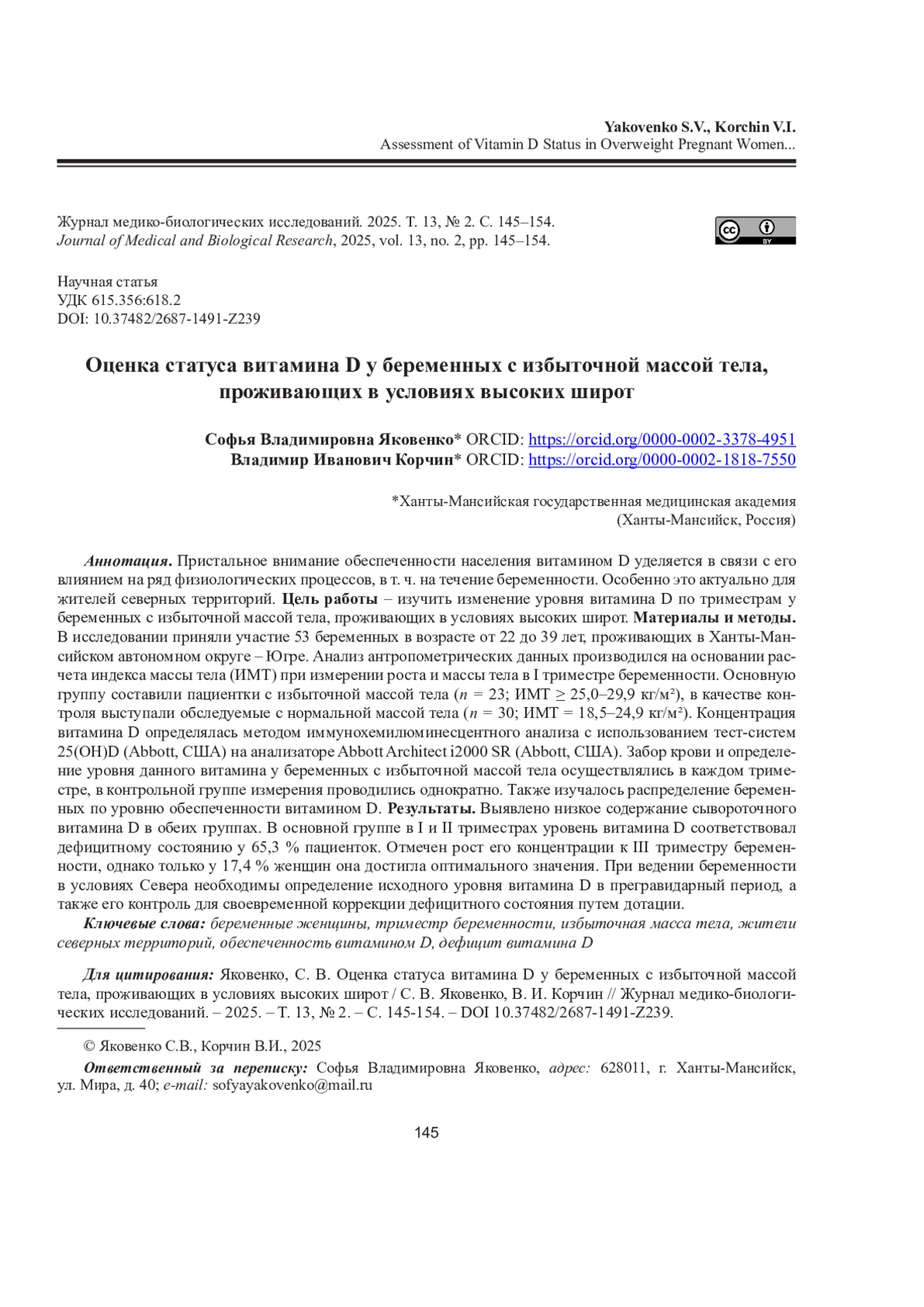 Материалы и методы. В исследовании приняли участие 53 беременных в возрасте от 22 до 39 лет, проживающих в Ханты-Мансийском автономном округе - Югре. Анализ антропометрических данных производился на основании расчета индекса массы тела (ИМТ) при измерении роста и массы тела в I триместре беременности. Основную группу составили пациентки с избыточной массой тела (n = 23; ИМТ ≥ 25,0-29,9 кг/м²), в качестве контроля выступали обследуемые с нормальной массой тела (n = 30; ИМТ = 18,5-24,9 кг/м²). Концентрация витамина D определялась методом иммунохемилюминесцентного анализа с использованием тест-систем 25(ОН)D (Abbott, США) на анализаторе Abbott Architect i2000 SR (Abbott, США). Забор крови и определение уровня данного витамина у беременных с избыточной массой тела осуществлялись в каждом триместре, в контрольной группе измерения проводились однократно. Также изучалось распределение беременных по уровню обеспеченности витамином D.