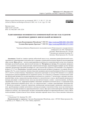 Результаты. Средний уровень двигательной активности выявлен у половины обследованных (56,3 %), доли студентов с низким и высоким уровнями двигательной активности были почти равны (19,7 и 24,0 % соответственно). Оценивались показатели адаптации по методу Р. М. Баевского и по данным спектрального анализа вариабельности сердечного ритма, что позволило установить положительное влияние физической активности на адаптационные возможности студентов. У испытуемых, ведущих малоподвижный образ жизни, определены высокая активность симпатического отдела, преобладание центрального контура регуляции и низкочастотных волн над высокочастотными в клино- и ортоположении, несбалансированный состав тела, характеризующийся снижением активной клеточной массы и содержания воды на фоне избыточной жировой массы тела, что свидетельствует о низких адаптационных возможностях. У физически активных студентов определены минимальная централизация управления сердечным ритмом, преобладающее влияние автономного контура регуляции и высокочастотных волн над низкочастотными, более высокая активность парасимпатического отдела. При ортостатической пробе снижение общей мощности спектра у них происходило на фоне уменьшения активности парасимпатического отдела. Физически активные студенты имели более низкие значения жировой массы тела и более высокие показатели активной клеточной массы, воды и общего обмена веществ. У них преобладали хорошие и высокие индексы компонентного состава тела, что способствовало поддержанию адаптационного потенциала на высоком уровне.